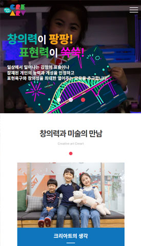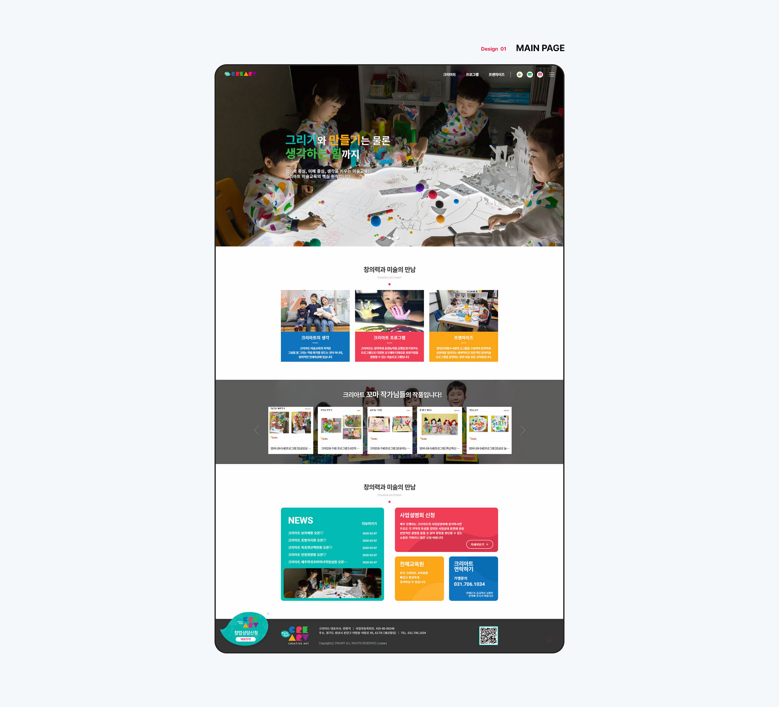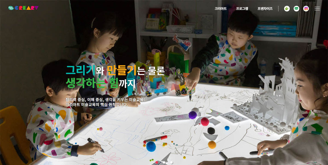 Creative (창의력) 와 Art (미술)의 합성어로, 미술을 통해 그림을 잘 그리는 직업 화가를 만드는 것이 아니라, 창의적인 인재 육성한다는 크리아트의 교육적 의지를 담은 브랜드 크리아트의 홈페이지 제작을 하였습니다. 반응형 웹으로 제작하여 최적화된 화면으로 다양한 기기에서도 서비스를 이용할 수 있도록 하였으며 기업 아이덴티티가 담긴 컬러사용으로 사용자의 이목을 집중시키고 기업의 가치와 이야기가 전달할 수 있도록 구성하였습니다.