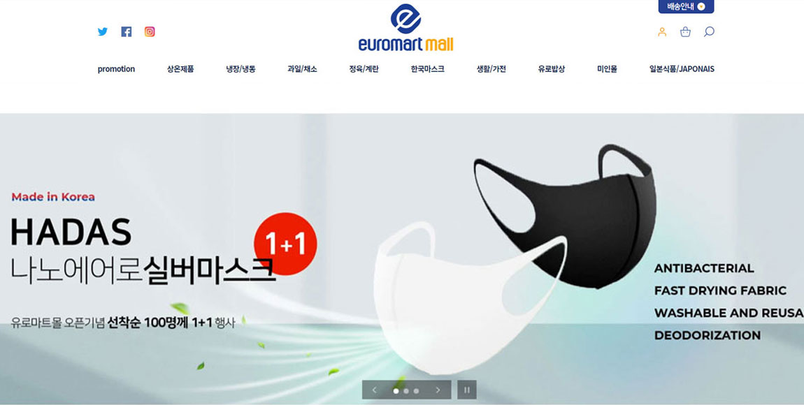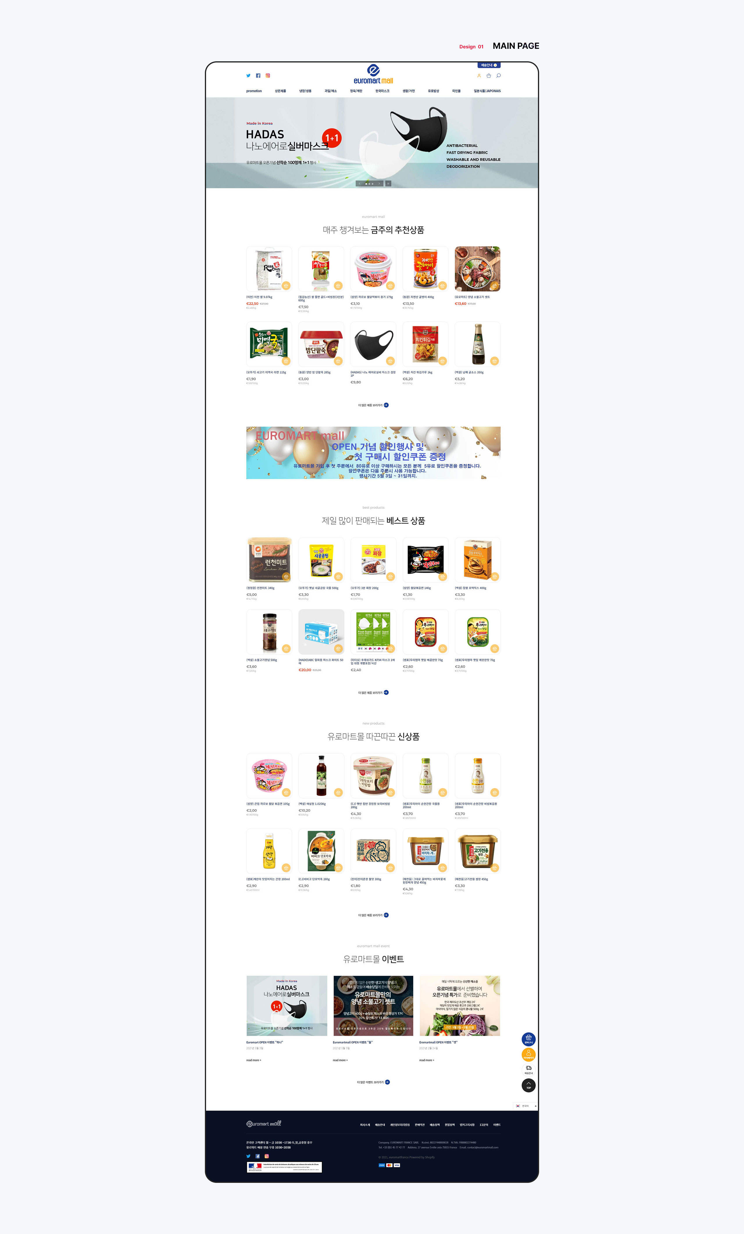 파리에서 식자재 판매를 하며 현지 매장운영과 함께 배송서비스와 픽업서비스를 제공하고 있는 유로마트몰의 쇼핑몰 사이트를 제작하였습니다. 쇼핑몰의 특성상 간결한 레이아웃으로 사용자들의 편의를 중점적으로 구성하여 세련되고 심플하게 제작하였습니다.