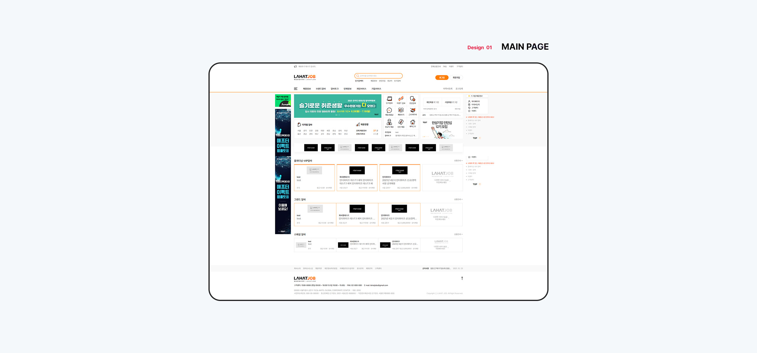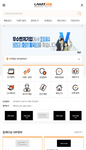구인·구직 솔루션 샘플로 취업포털사이트 LAHATJOB 의 홈페이지를 제작하였습니다. 다양한 기기에서도 서비스를 최적화된 화면으로 이용할 수 있도록 반응형 웹으로 제작하였으며 불필요한 요소들을 덜어내고 간소한 레이아웃으로 사용자에게 편의성과 최적화된 서비스를 제공합니다.