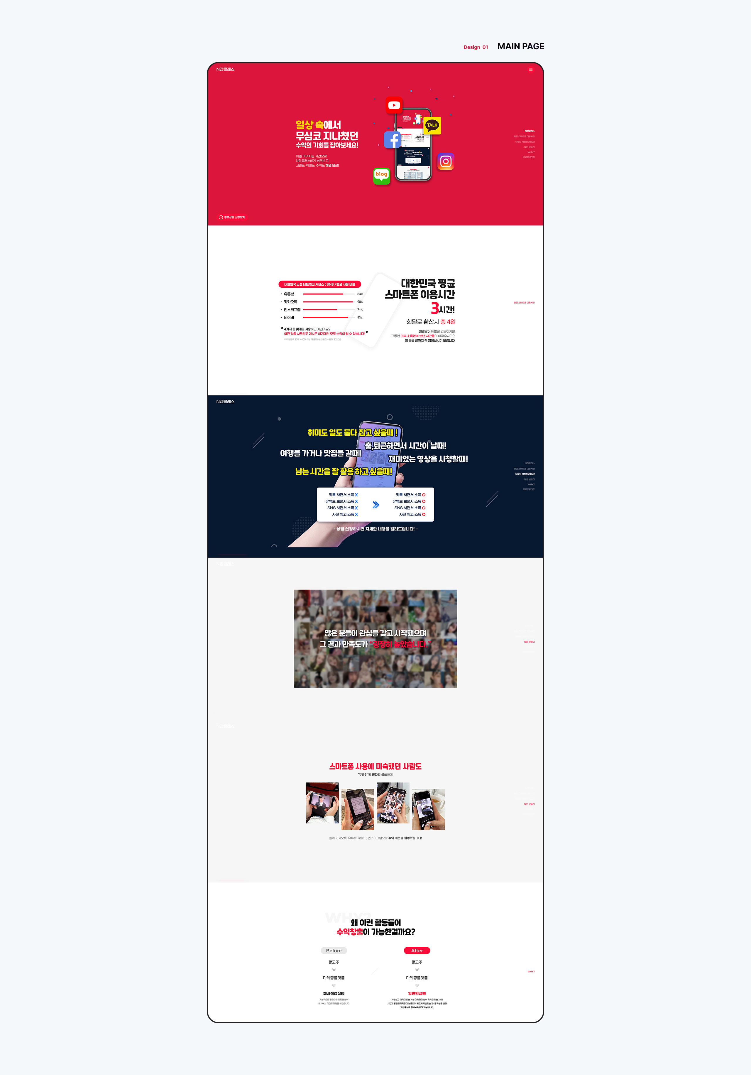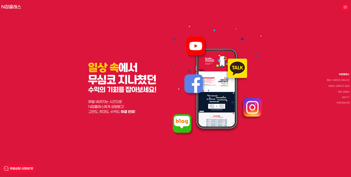 시간과 공간의 제약 없이 노출돼 빠르게 확산하는 SNS 특성을 살려 개인 홍보로 인해 일상에서 무심코 지나쳤던 수익화를 가능하게 해주는 기업 N잡 클래스의 랜딩사이트를 제작하였습니다. 사용자들이 이해하기 쉽도록 간단하면서 컨텐츠의 정보가 잘 전달 될 수 있는 레이아웃으로 구성하였으며 포인트 컬러를 사용하여 이목을 집중시킬 수 있도록 하였습니다.