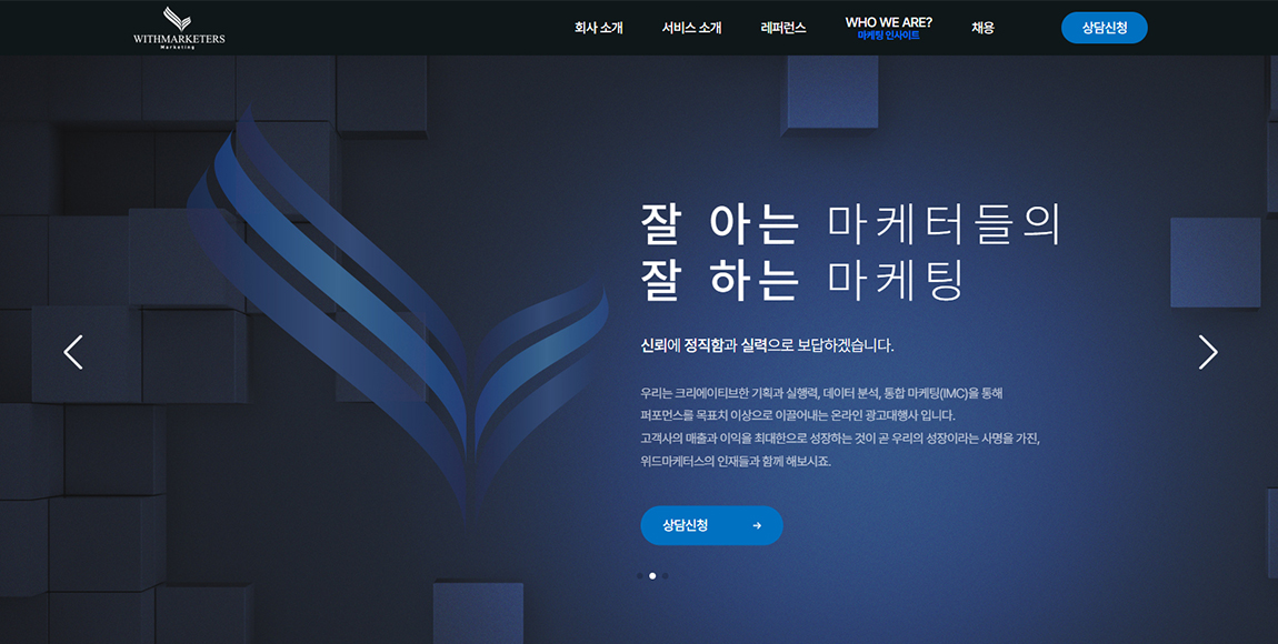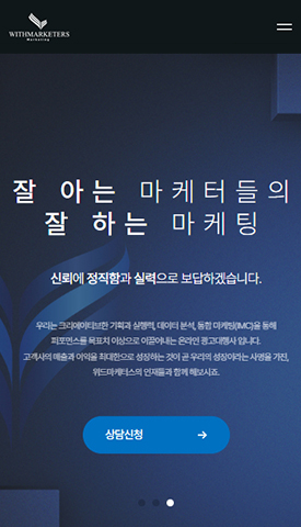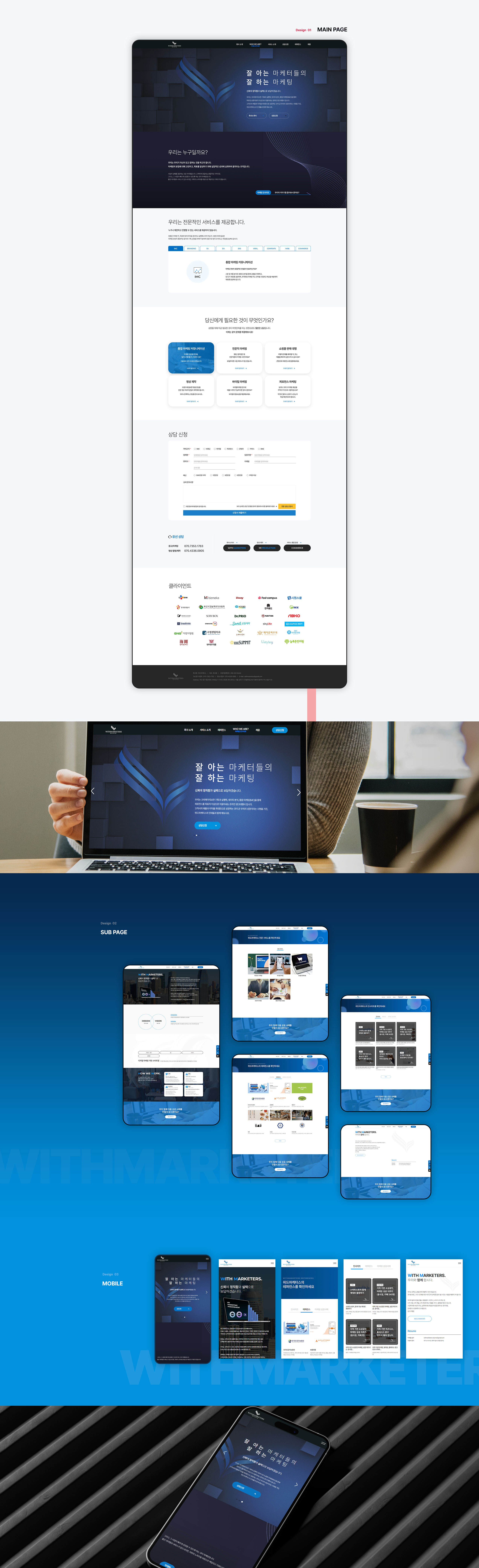 콘텐츠와 디지털 중심의 광고대행사 위드마케터스의 공식 홈페이지를 반응형 웹으로 제작하였으며 직관적인 레이아웃과 디자인을 적용하여 사용자들이 정보에 집중할 수 있도록 제작되었습니다. 신뢰와 정직함을 지향하는 위드마케터스의 아이덴티티를 적용하여 정제된 폰트와 컬러를 사용하여 디자인에 통일성을 높였습니다.
