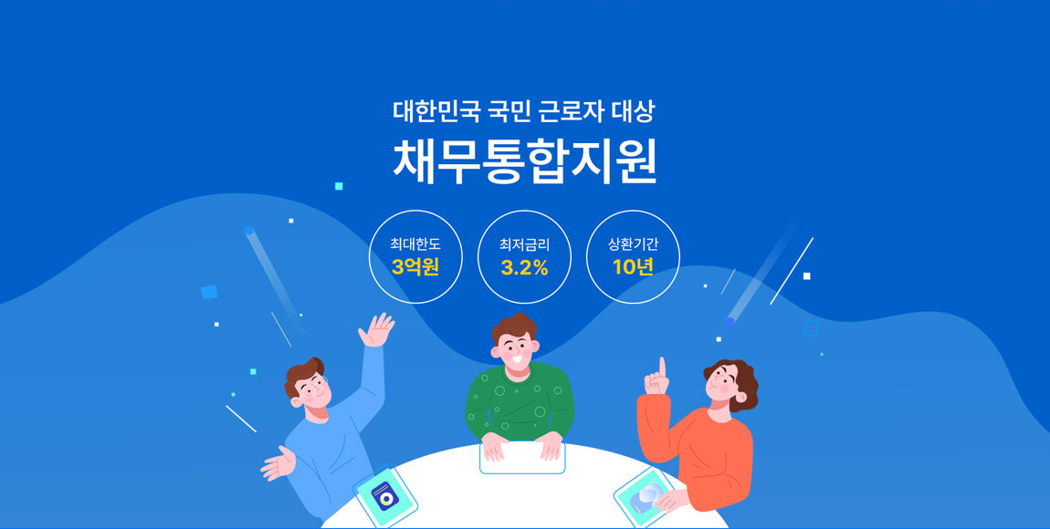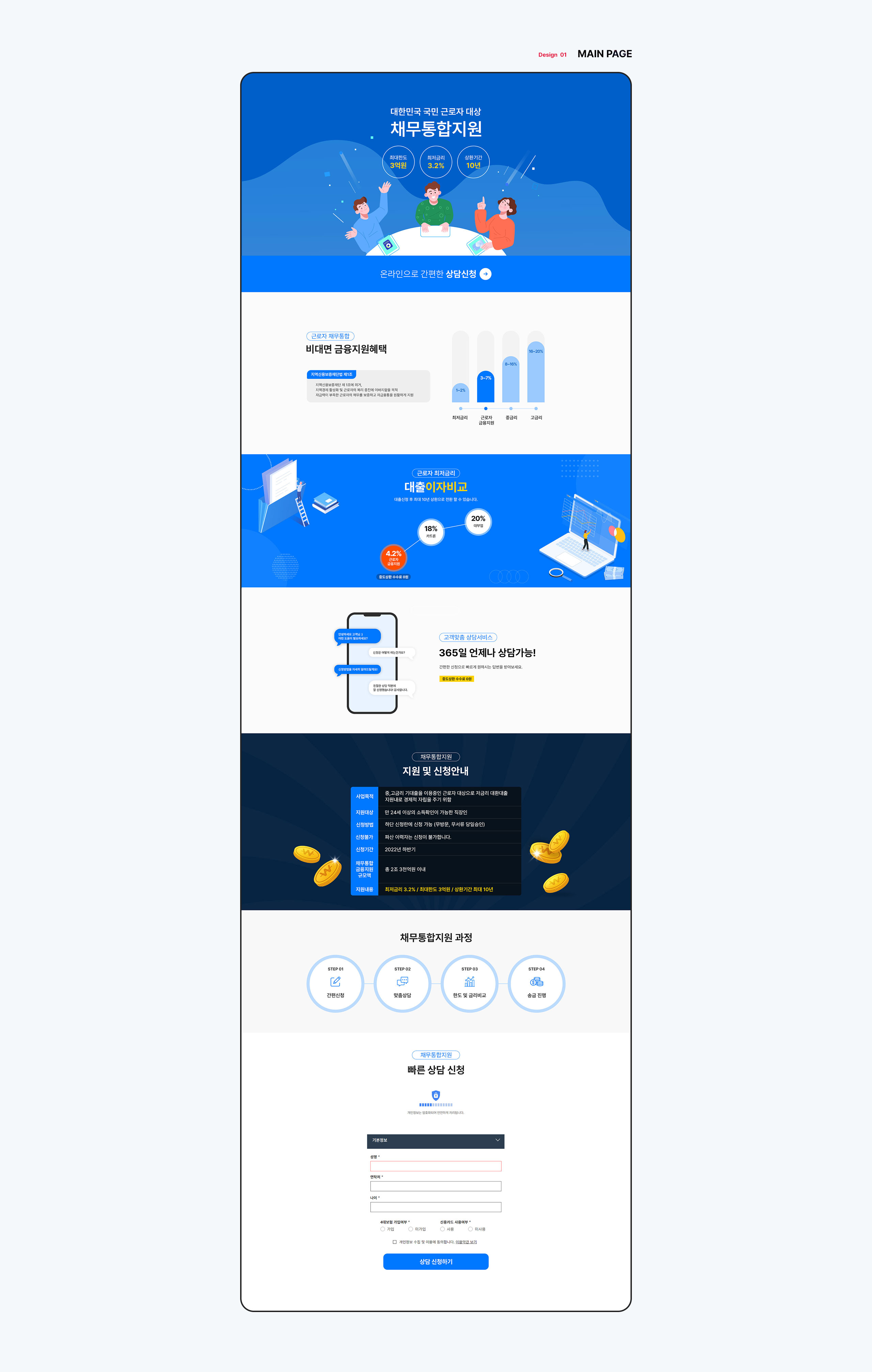 대한민국 국민 근로자를 대상으로 최저금리로 대출 서비스를 제공하는 채무통합센터의 랜딩페이지를 제작하였습니다. 전체적으로 텍스트와 일러스트를 적절히 배치하여 세련되고 심플한 디자인으로 사용자들에게 전문성과 신뢰감 전달을 목표로 제작하였습니다.