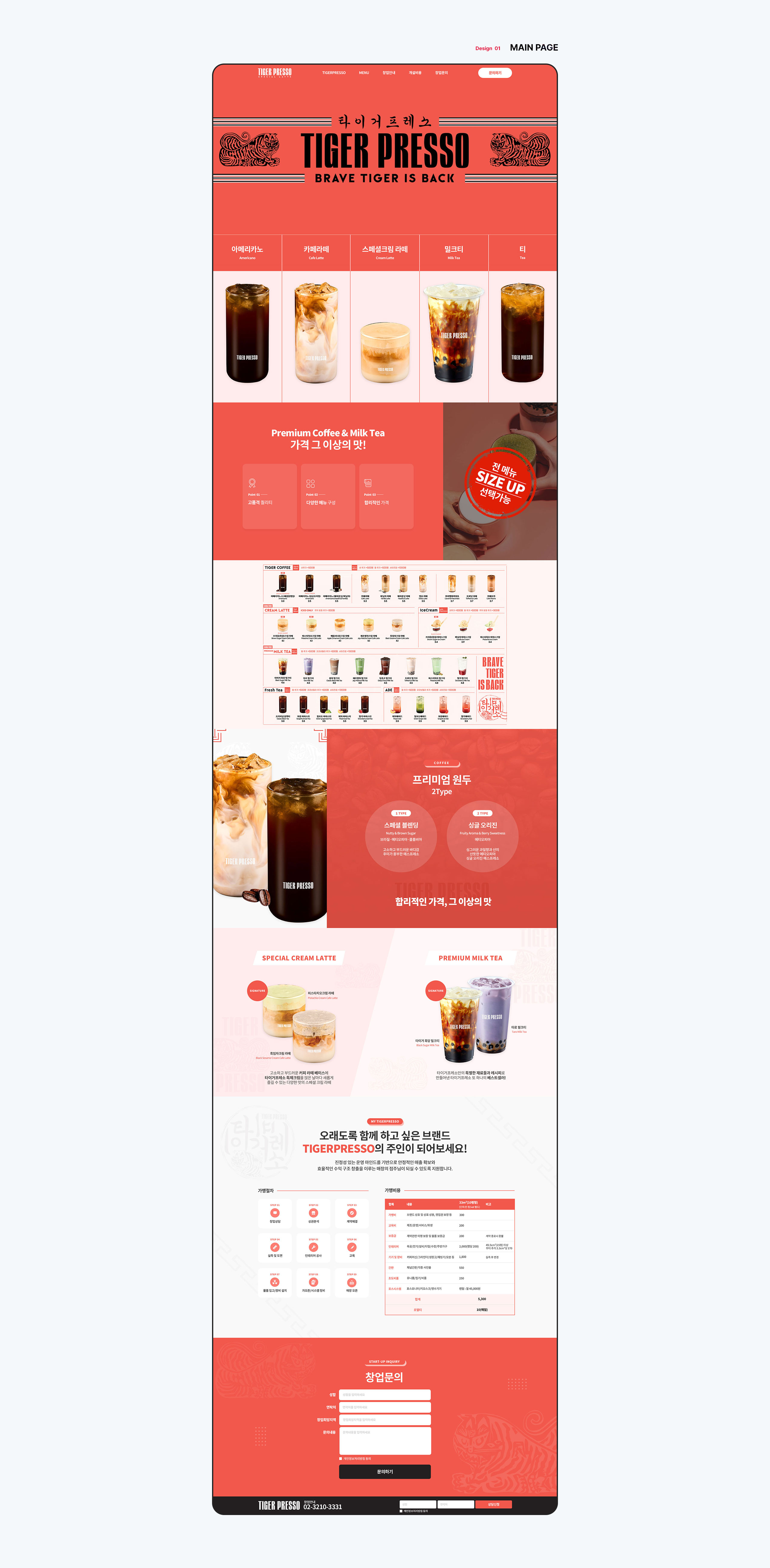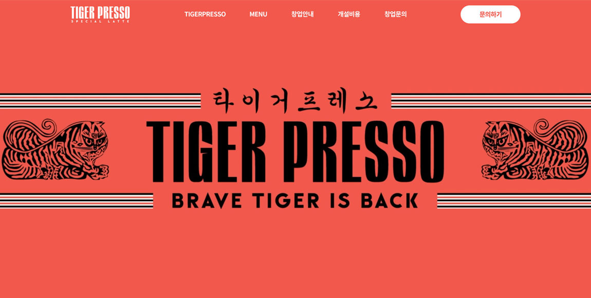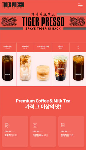 고품격 퀄리티, 다양한 메뉴 구성, 합리적인 가격, 그 이상의 맛의 커피와 밀크티를 판매하는 프랜차이즈 기업 타이거프레소의 랜딩페이지를 제작하였습니다. 전체적으로 기업의 아이덴티티와 브랜드 이미지를 강조하는 일관된 컬러와 디자인을 적용하였으며 마지막으로는 랜딩페이지의 목적인 창업 문의로 자연스럽게 접근할 수 있도록 구성하였습니다.