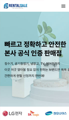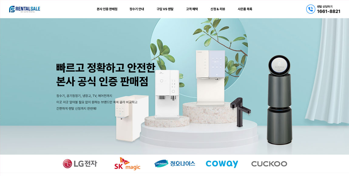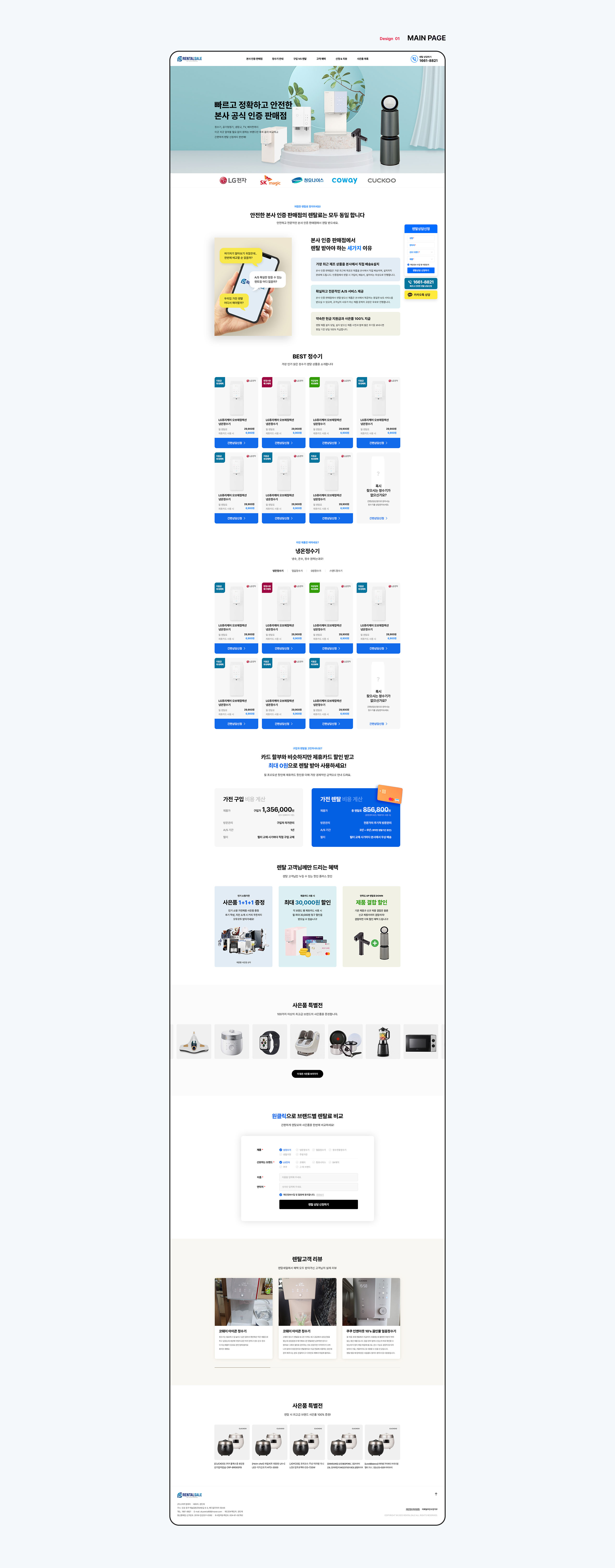 정수기, 공기청정기, 냉장고, TV, 에어컨까지 이곳저곳 알아볼 필요 없이 원하는 브랜드만 쏙쏙 골라 비교하고 간편하게 렌탈 신청까지 한 번에 해결해 주며 빠르고 정확하고 안전한 본사 공식 인증 판매점 렌탈세일의 랜딩페이지를 제작하였습니다. 텍스트와 이미지를 적절히 간소화한 배치로 사용자가 제품의 정보와 사이트의 전달 메세지를 쉽게 확인할 수 있도록 구성하였으며 전체적으로 세련되고 심플하게 제작하였습니다.