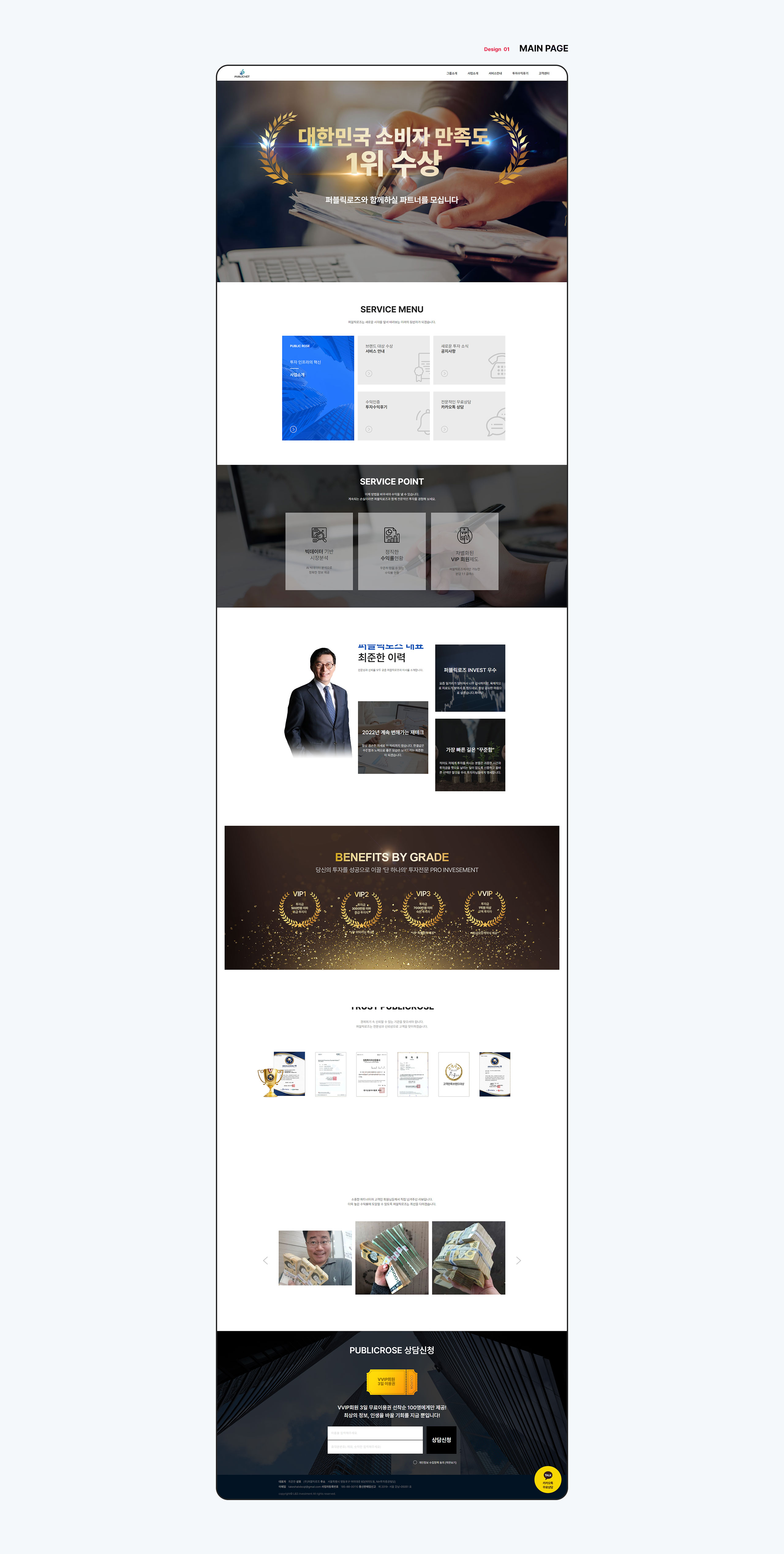 빅데이터 기반으로 시장분석, 정직한 수익률, 차별화된 VIP 회원 제도로 전문성과 신뢰를 모두 갖춘 투자전문 기업 퍼블릭로즈의 랜딩페이지를 제작하였습니다. 기업의 메세지와 전문성을 고려한 디자인 요소들과 컨텐츠가 잘 안내되는 레아이웃으로 제작하였습니다.