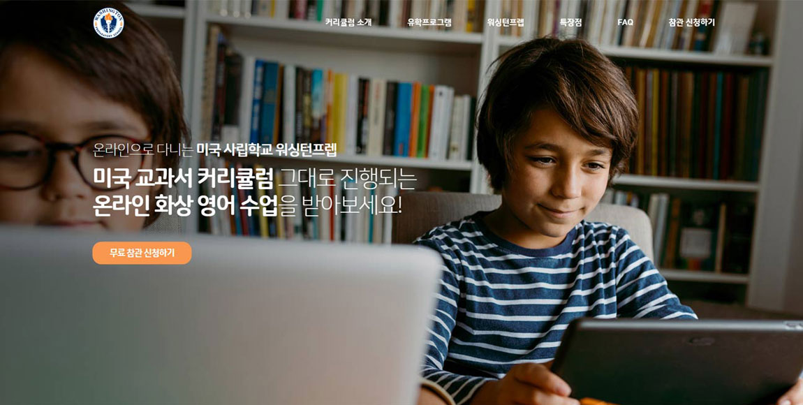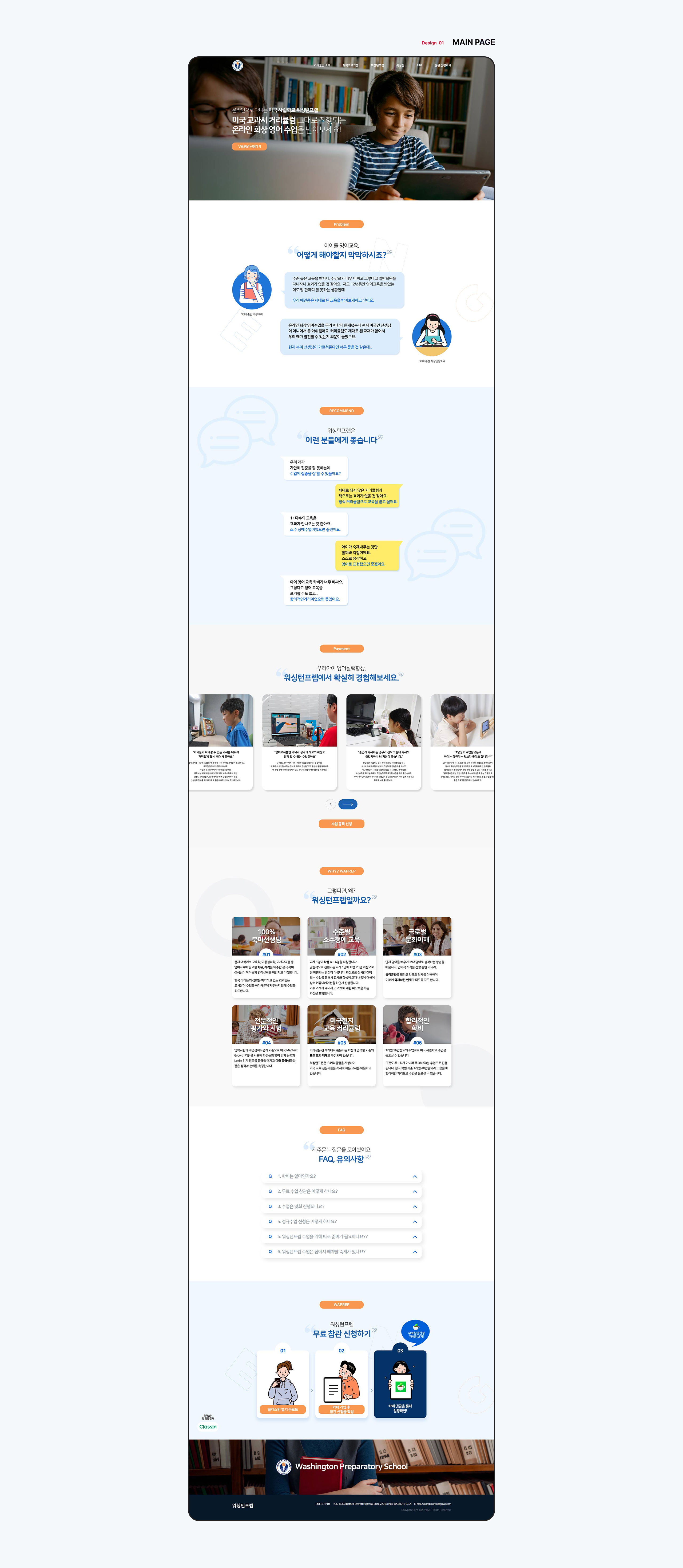 미국 교과서 커리큘럼 그대로 진행되는 온라인 화상 영어 수업을 제공하는 기업 워싱턴프렙의 랜딩페이지를 제작하였습니다. 간단하고 정보전달이 쉬운 섹션별 콘텐츠 및 수업 설명을 통해 사용자들에게 정보의 이해와 자연스럽게 수업 신청으로 이어질 수 있도록 구성하였습니다.