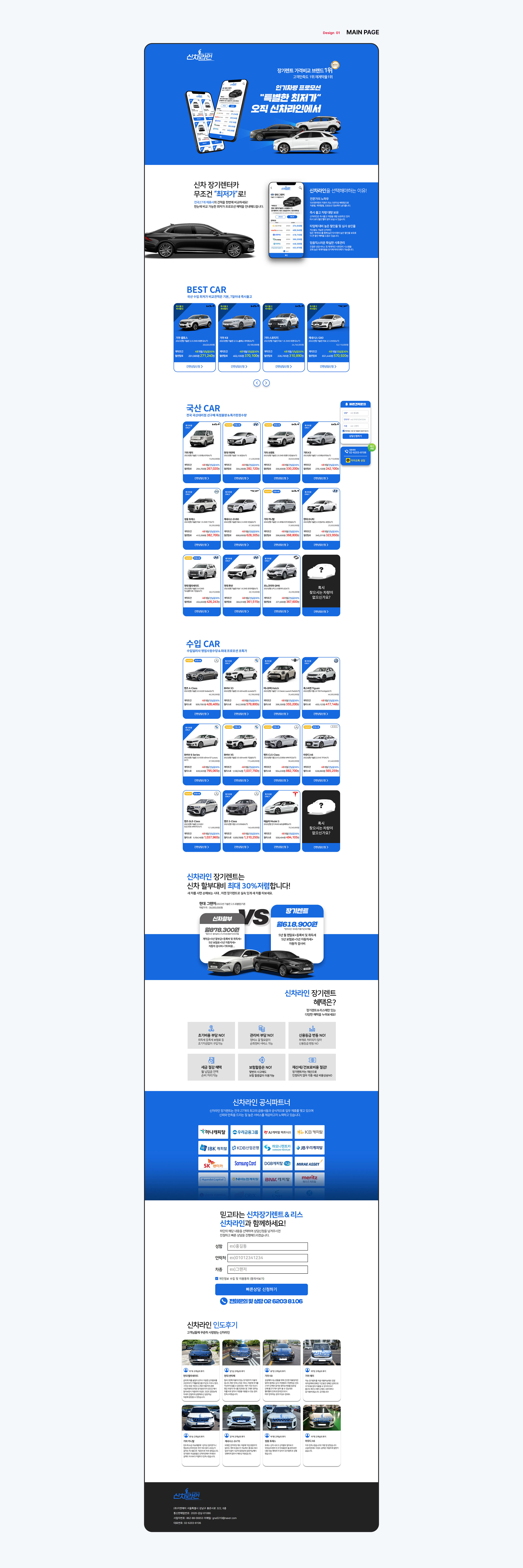 전문가의 노하우, 즉시 출고 차량 대량 보유, 다른 업체 대비 높은 할인율 및 심사 승인율, 믿음직스러운 확실한 사후관리로 장기대여 가격 비교 브랜드 1위, 고객만족도 1위 재계약율 1위인 차량 장기대여, 리스를 제공하는 기업 신차라인의 랜딩페이지를 제작하였습니다. 사용자 누구나 이해하기 쉬운 직관성 및 전달력 전달에 초점을 두고 컨텐츠를 명확하게 전달하기 위해 전체적으로 통일된 컬러감과 레이아웃등으로 현대적이고 전문적인 디자인으로 구성하였습니다.