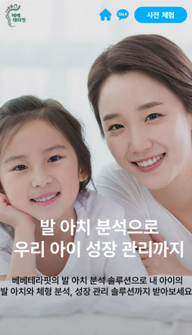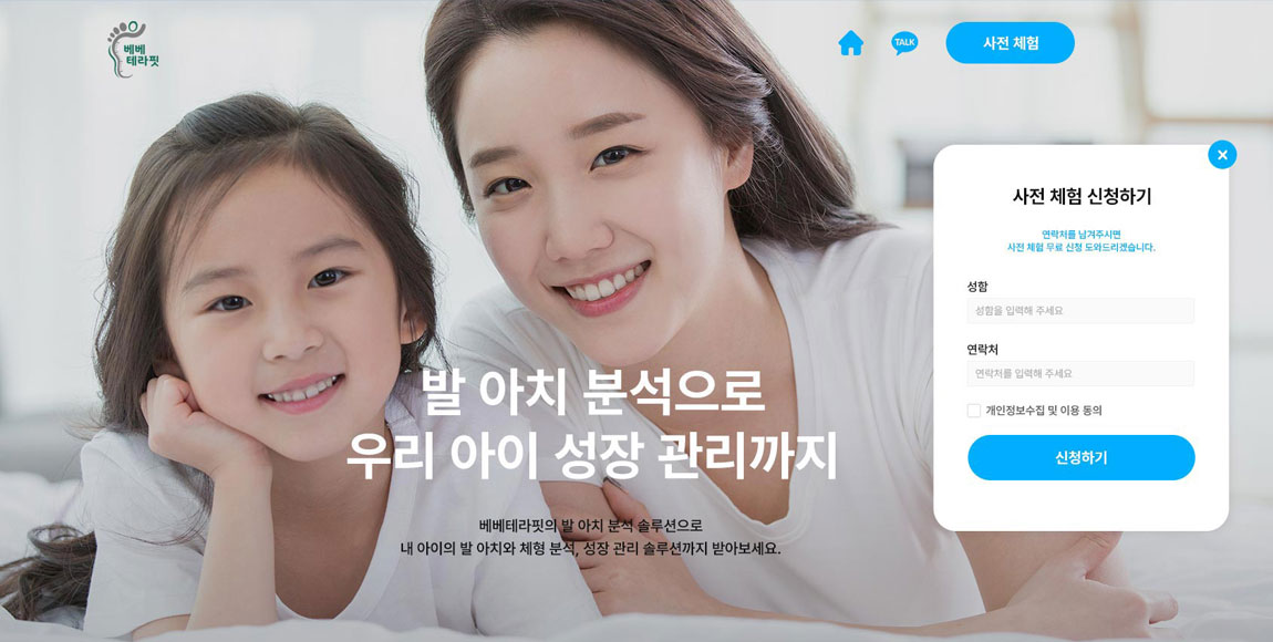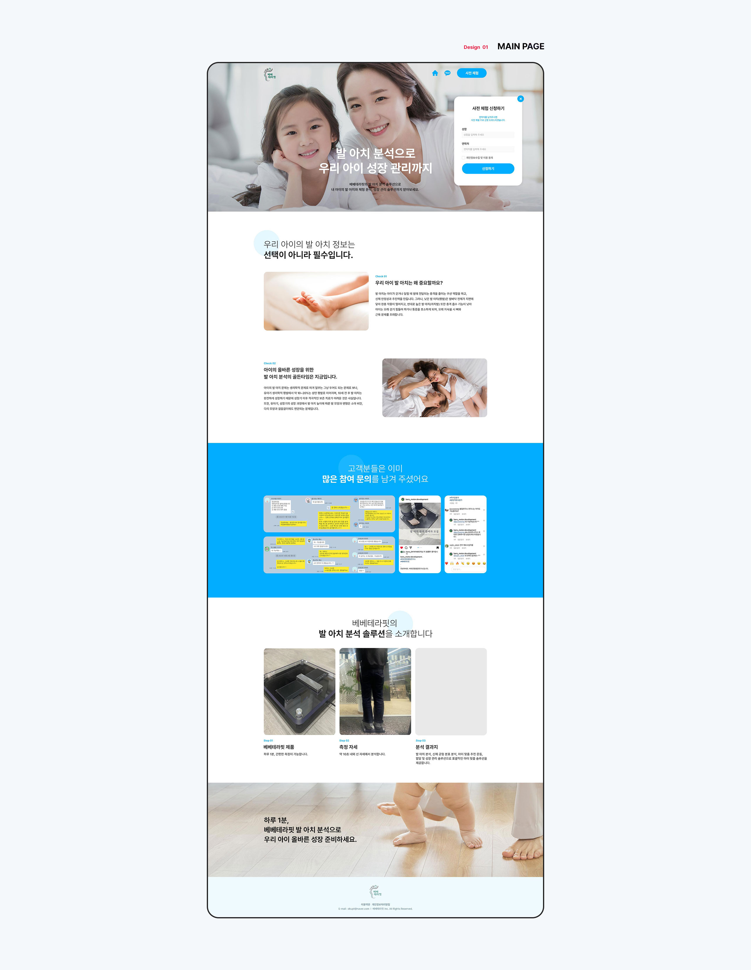 발 아치 분석 솔루션으로 내 아이의 발 아치와 체형 분석, 성장 관리 솔루션까지 제시해주는 기업 베베테라핏의 랜딩페이지를 제작하였습니다. 이해하기 쉬우며 컨텐츠가 잘 안내되는 구성으로 제작하여 포인트 컬러로 조화롭게 사용하여 정보전달에 더욱 쉽도록 제작하였습니다.