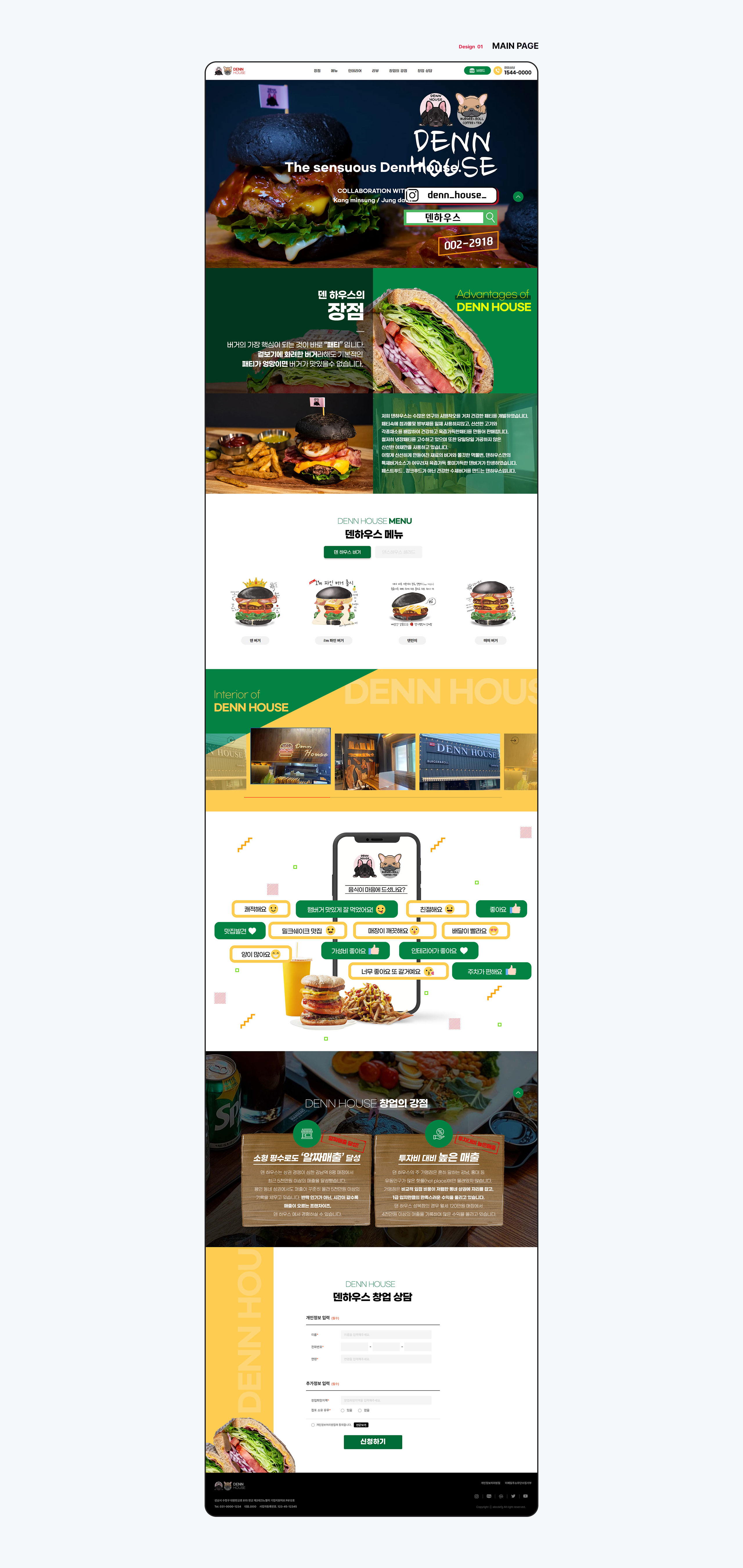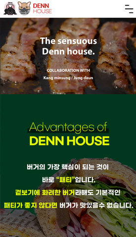 수많은 연구와 시행착오를 거쳐 건강한 패티를 개발하여 당일 가공하지 않은 신선한 채소만을 사용하여 패스트푸드, 정크푸드가 아닌 건강한 수제버거를 만드는 프랜차이즈 덴하우스의 랜딩페이지를 제작하였습니다. 섹션별 컨텐츠 및 정보를 전달하는데 포인트 컬러 사용을 조화롭게 사용하고 시각적 요소들을 통해 세련되면서 심플하게 브랜드의 특징을 강조할 수 있도록 제작하였습니다.