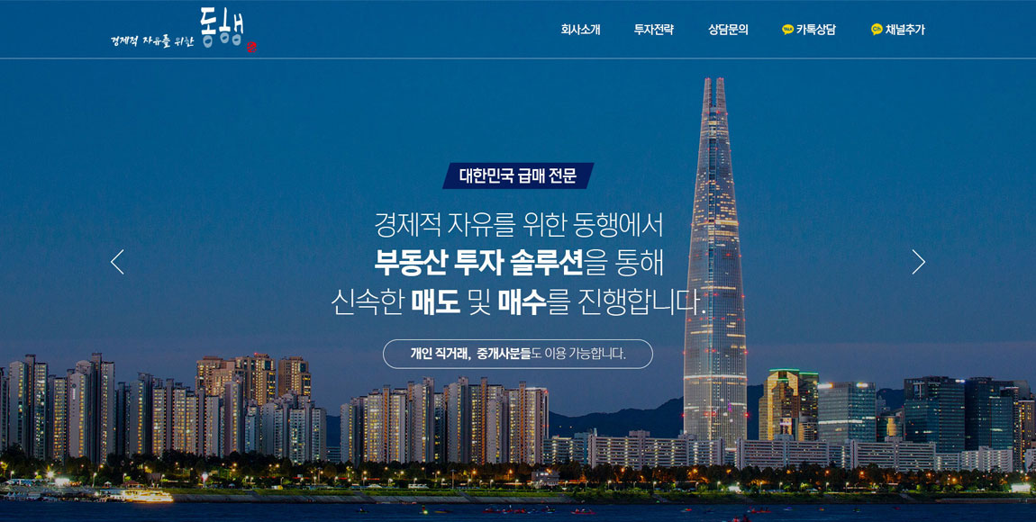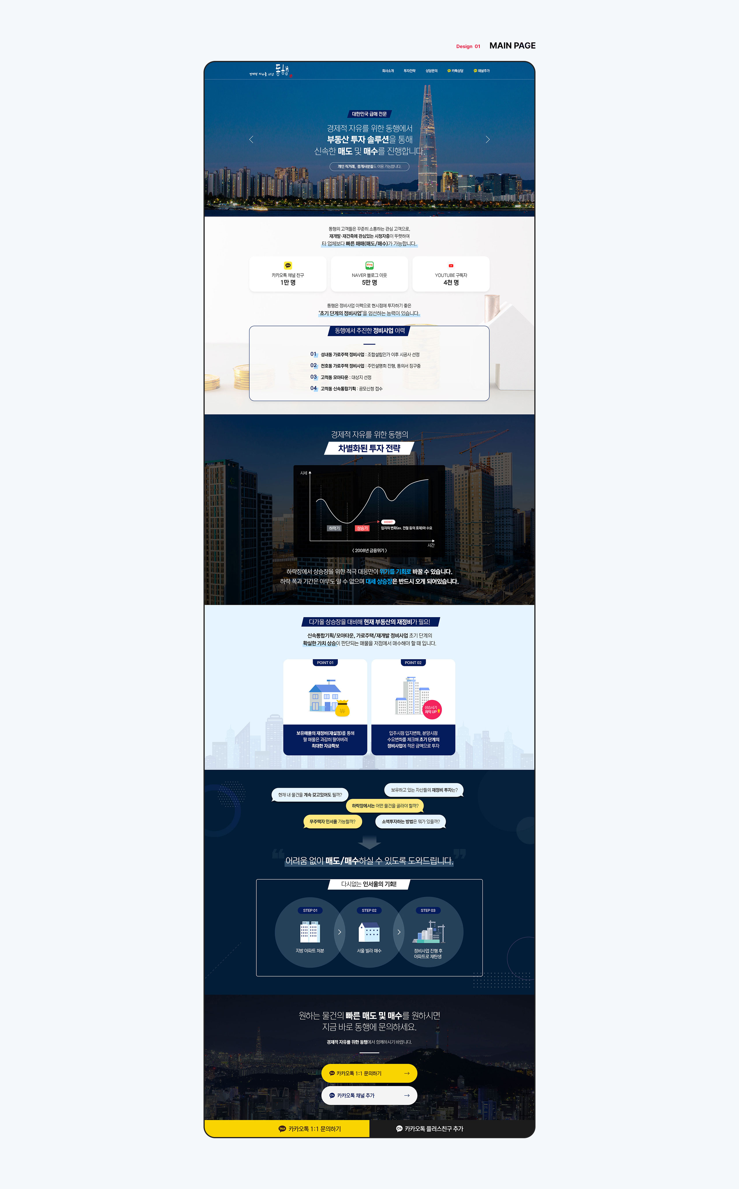 부동산 투자 솔루션을 통해 타 업체보다 신속한 매도 및 매수를 진행해 경제적 자유를 제시해 주는 동행의 랜딩페이지를 제작하였습니다. 텍스트와 이미지를 적절히 배치하여 간단하면서 사용자들은 정보를 쉽게 얻을 수 있도록 구성하였으며 포인트 컬러를 조화롭게 사용하여 시각적 즐거움을 더 해 주었습니다.