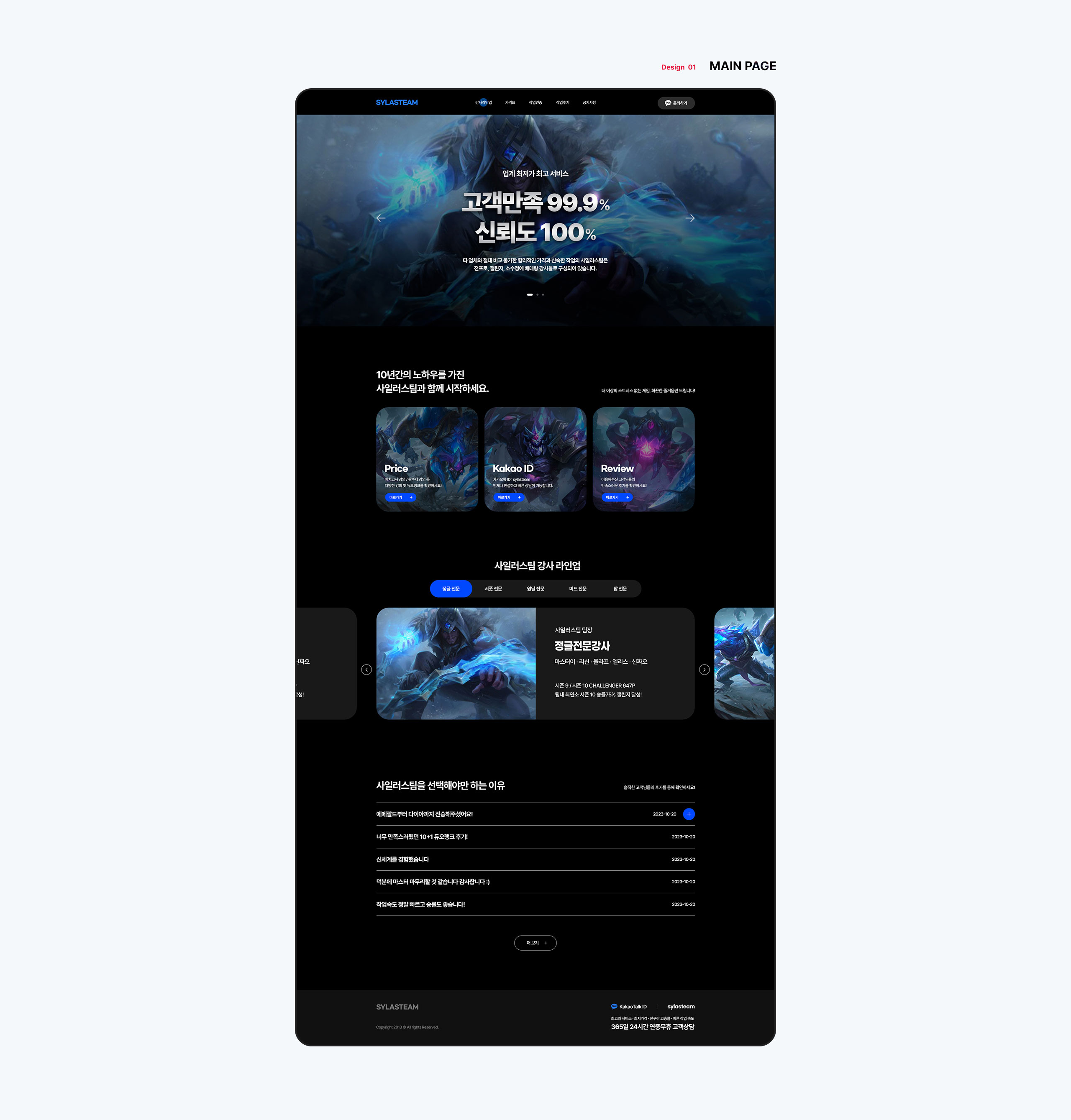 전 프로, 챌린저, 소수정예 베테랑 강사들로 구성되어 10년간의 노하우로 타 업체와 절대 비교 불가한 합리적인 가격과 신속한 작업으로 고객 만족도 99.9%와 신뢰도 100%의 업계 최고의 서비스를 제공하는 사일러스팀의 랜딩페이지를 제작하였습니다. 간결한 문구, 간소한 레이아웃으로 콘텐츠 중심으로 구성하였으며 포인트적인 컬러감과 일러스트 이미지들을 통해서 사용자들에게 전달력을 극대화하고자 하였습니다.