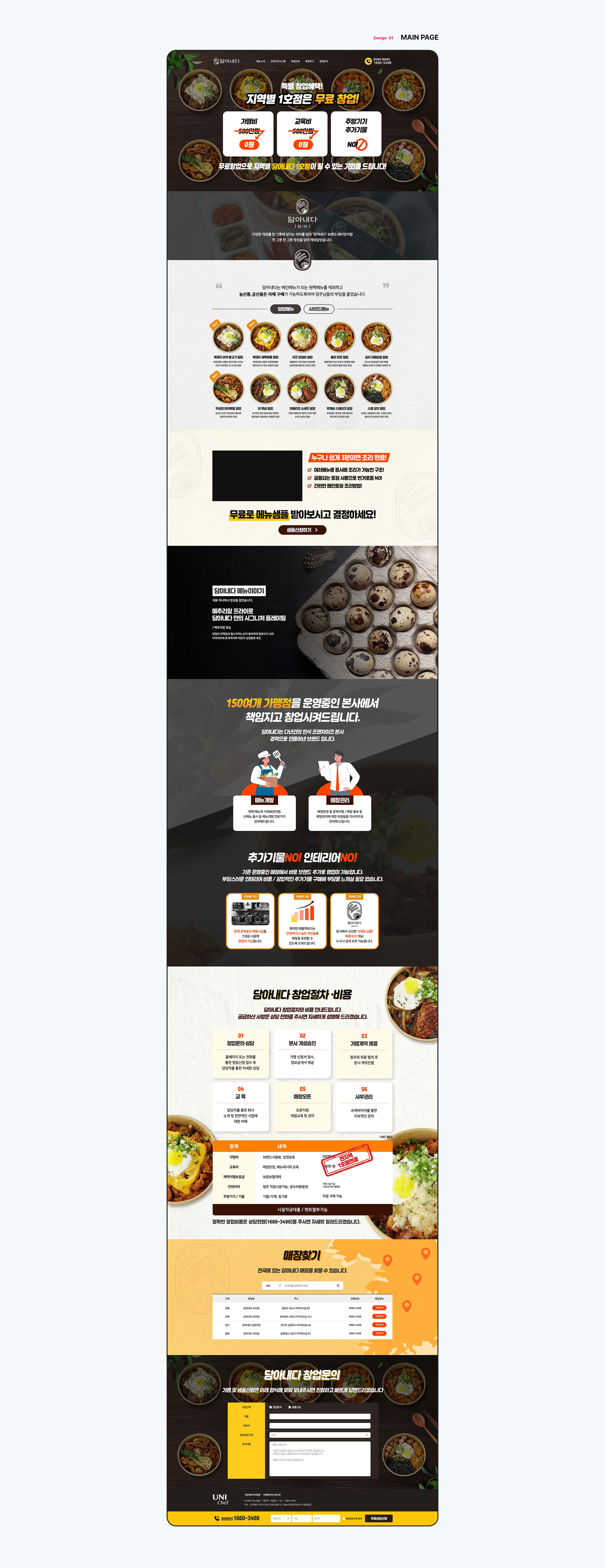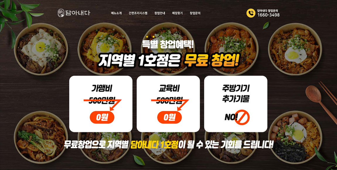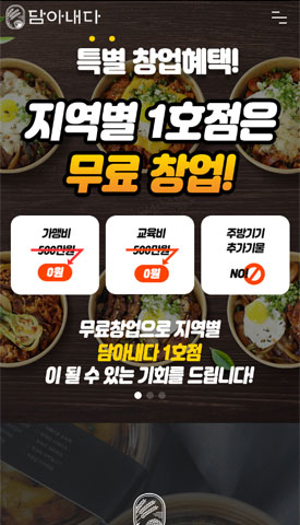 다양한 재료를 한 그릇에 한 그릇 한 그릇 정성을 담아 채워내는 덮밥 프랜차이즈 담아내다의 랜딩페이지를 제작하였습니다. 일관된 폰트와 컬러 사용으로 디자인의 통일성을 높여 정돈되어 보이면서 일러스트를 통해 텍스트를 통한 설명보다 사용자들이 정보를 더욱 쉽게 이해할 수 있도록 구성하였습니다.