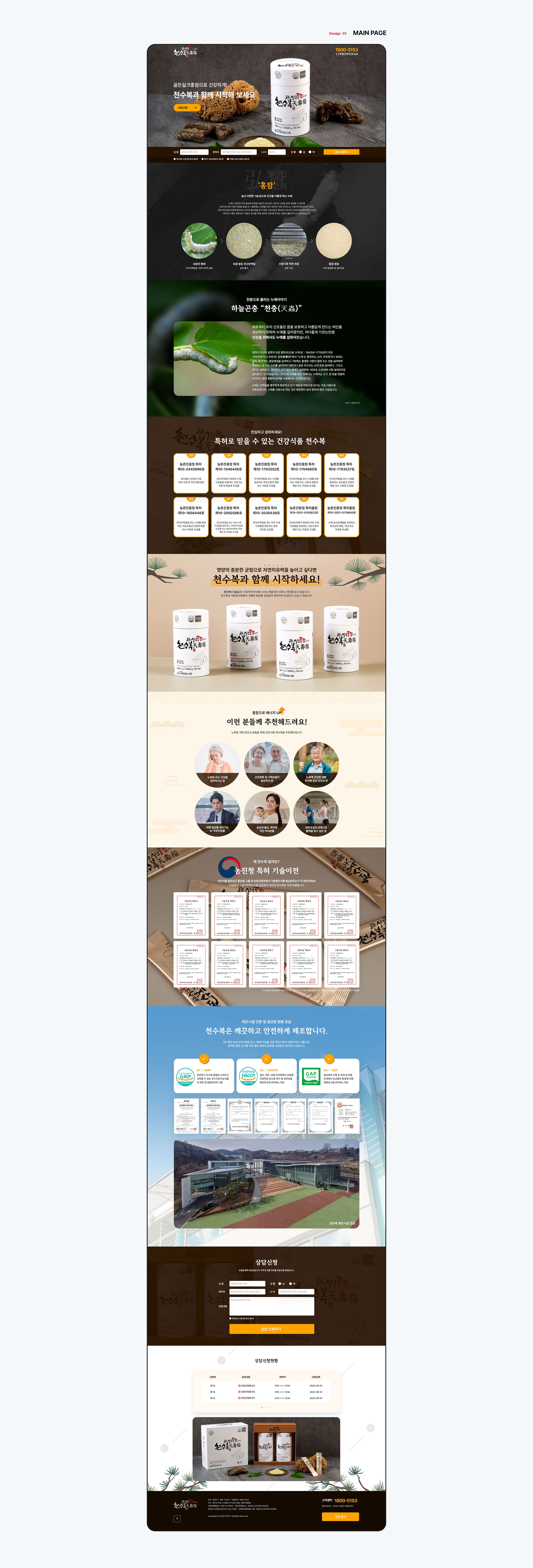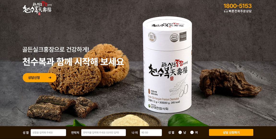 골든실크 홈잠으로 건강하게 특허원료로 믿을 수 있는 건강식품을 제조, 판매하는 기업 천수복의 랜딩페이지를 제작하였습니다. 간단하고 정보전달이 쉽도록 섹션별 콘텐츠를 구성을 통해 사용자들이 쉽게 정보에 접근할 수 있도록 구성하였습니다.