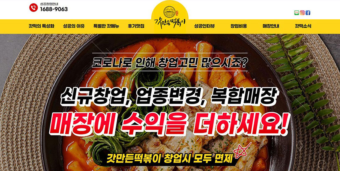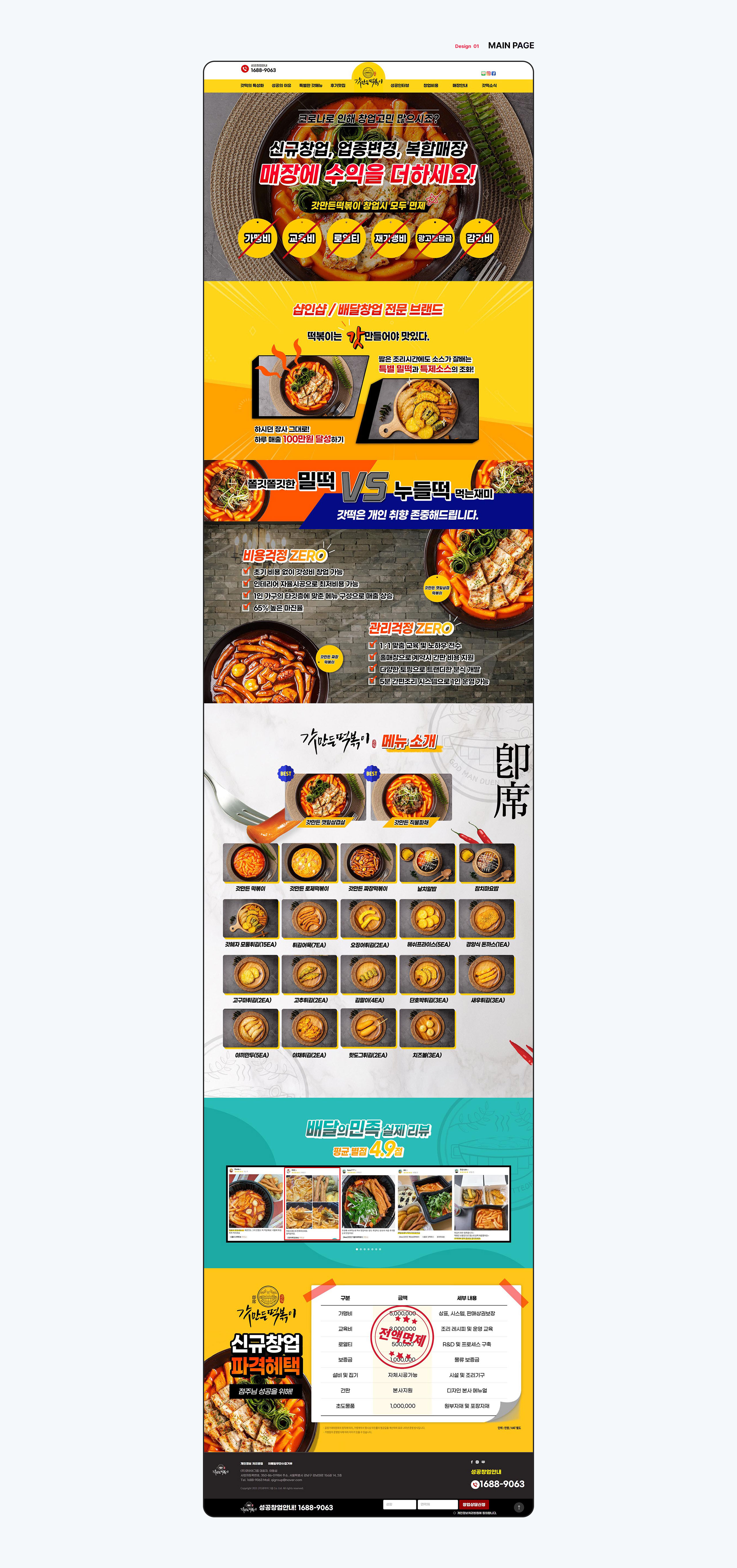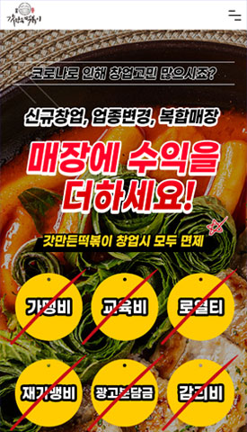 비용 걱정 제로, 관리 걱정 제로, 샵인샵 / 배달 창업 전문으로 하는 갓 만든 떡볶이의 랜딩페이지를 제작하였습니다. 직관적인 디자인과 포인트 컬러를 조화롭게 사용하여 밝고 경쾌하면서 톡톡 튀는 컬러로 사용자들의 이목을 끌어 집중도를 높이도록 구성하였습니다.
