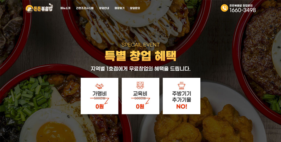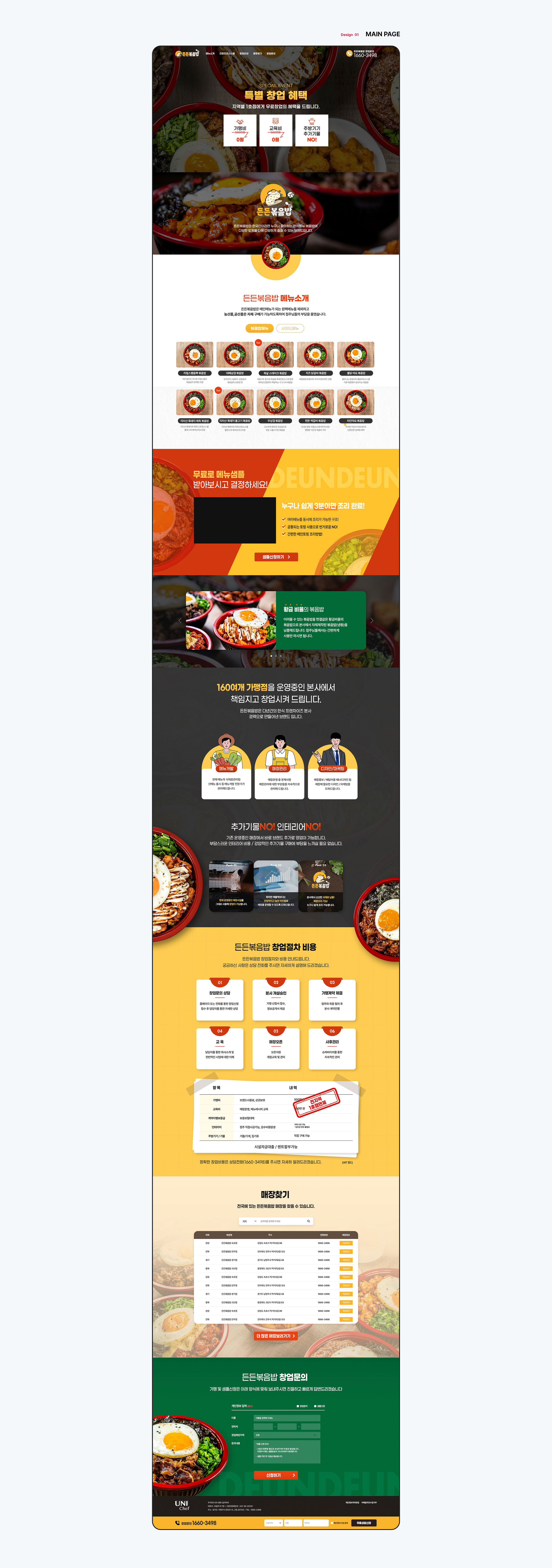 한국인이라면 누구나 좋아하는 한식메뉴 볶음밥에 다양한 토핑을 더해 다양하게 즐길 수 있는 브랜드 든든볶음밥의 랜딩페이지를 제작하였습니다. 직관적인 디자인과 포인트 컬러를 조화롭게 사용하여 밝고 경쾌하면서 톡톡 튀는 컬러로 사용자들의 이목을 끌어 집중도를 높이도록 구성하였습니다.