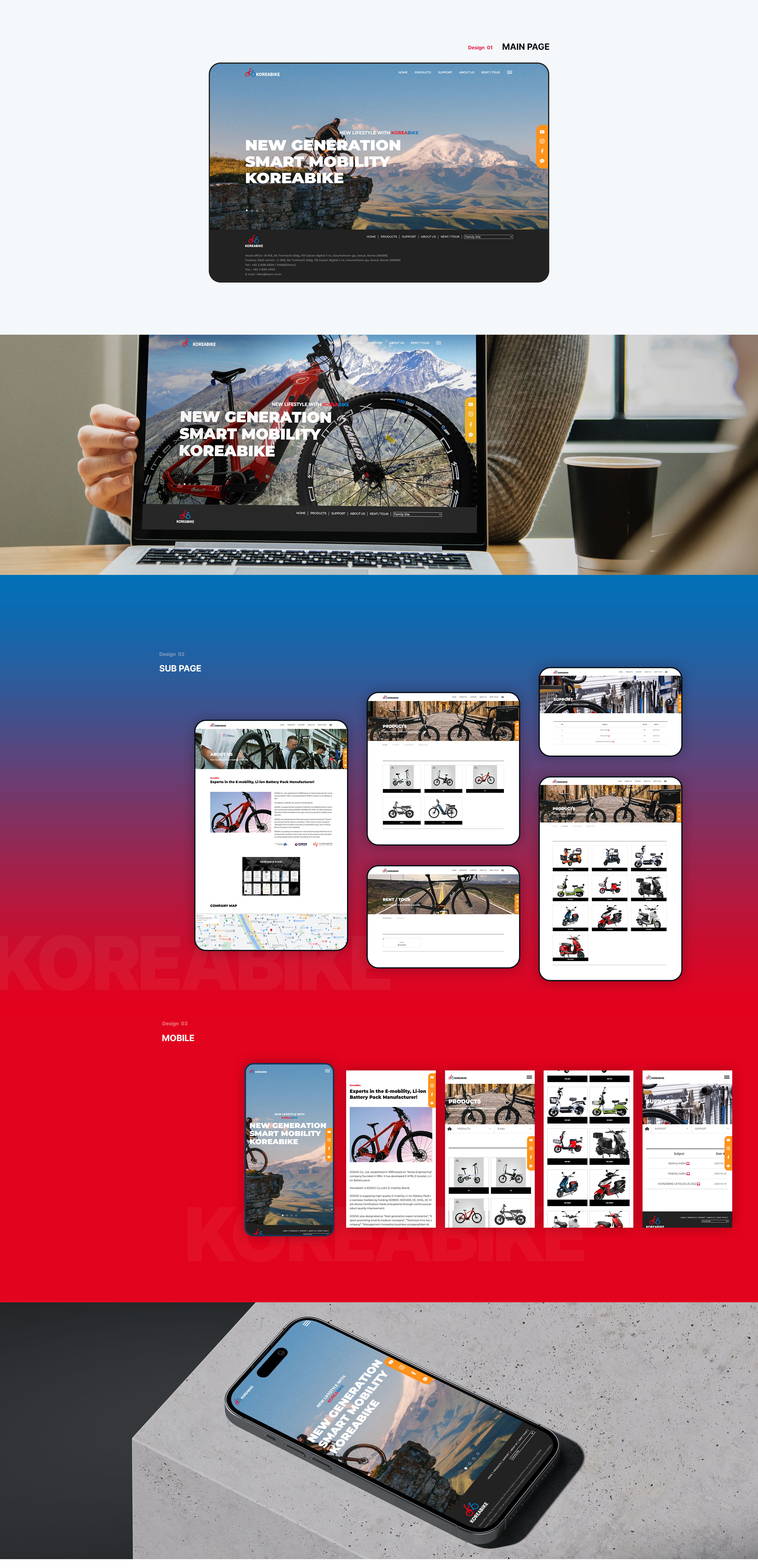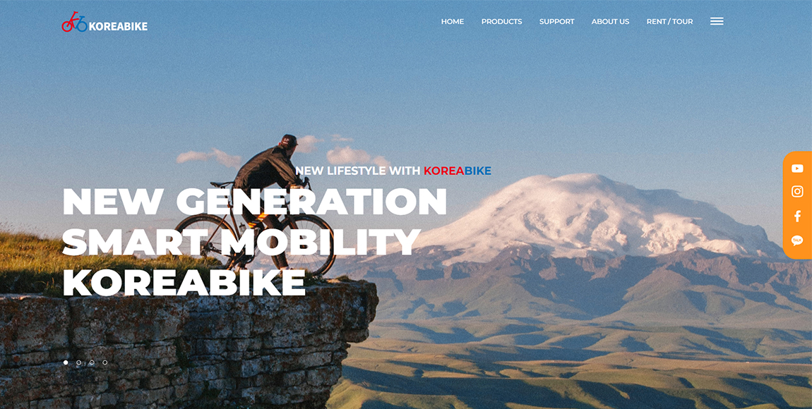 대한민국의 대표적인 E-모빌리티 제조사로서 세계 40여 개국에 수출하고 있는 (주)코이엔의 E-모빌리티 브랜드 코리아바이크의 공식 홈페이지를 제작하였습니다. 반응형 홈페이지 제작을 통해 다양한 기기에서 사용자들이 편리하게 정보를 확인할 수 있도록 하였고, 정보에 온전히 집중할 수 있도록 레이아웃과 디자인을 적용하였습니다.