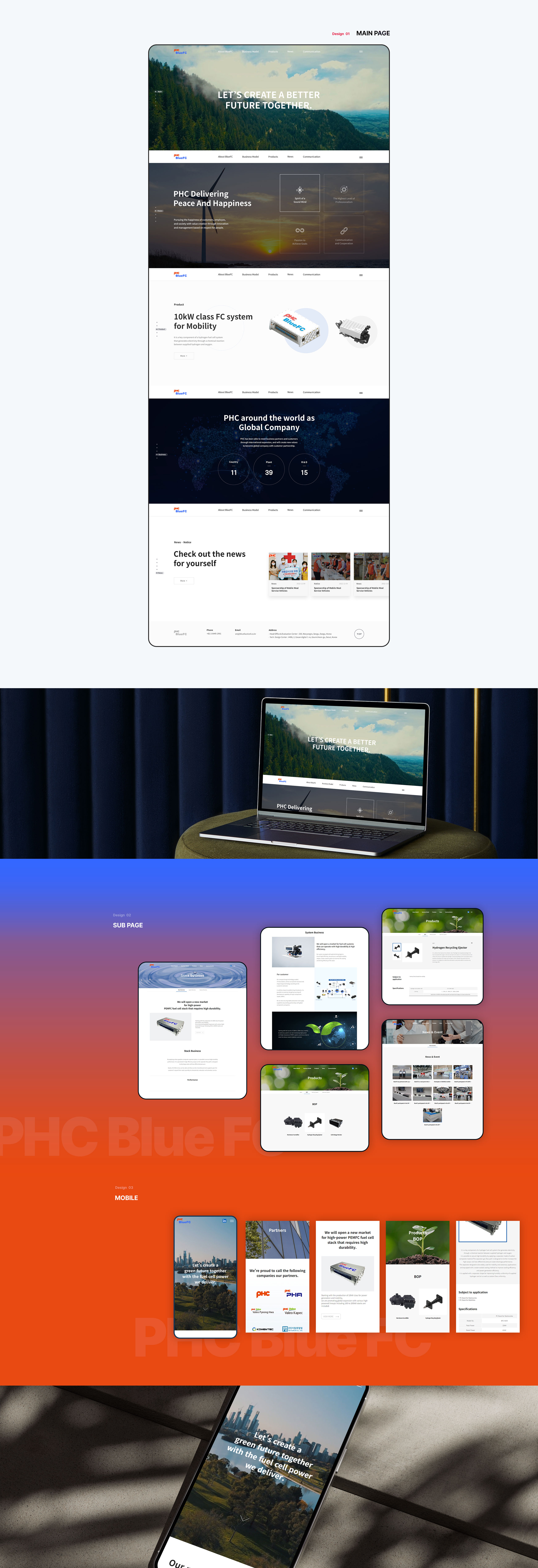 고출력, 고온 PEMFC 시스템 개발과 글로벌 파트너들과 함께 글로벌 수소 사회를 구축하고자 하는 블루에프씨의 공식 홈페이지로 반응형웹으로 구성하였습니다. 전체적으로 보기 편한 구성으로 사용자들이 정보를 쉽게 얻을 수 있도록 하였으며 브랜드의 철학을 담아내고자 하였습니다.