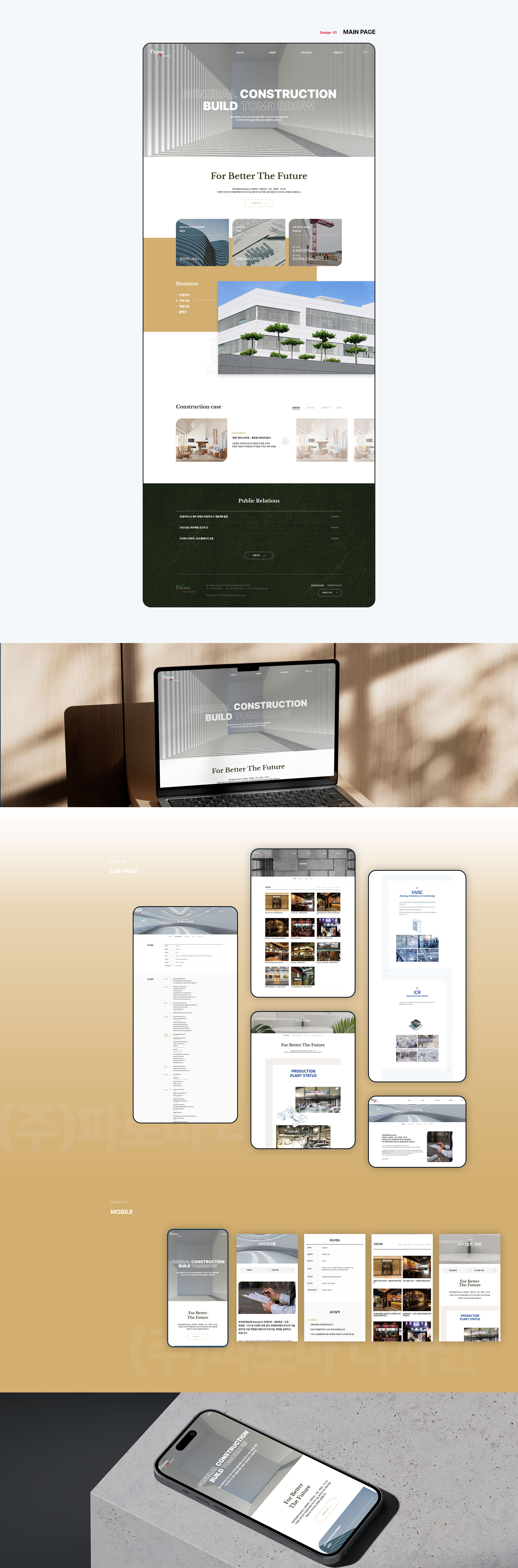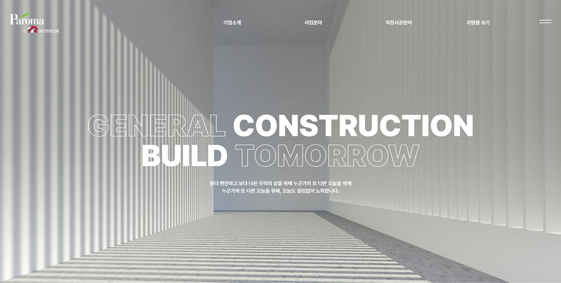 인테리어 · 내장 목공 · 수장 · 목창호 · 가구 등 다양한 건축 장식 자재 분야에서 최고의 기술 설계 및 시공 역량을 바탕으로 지속 가능 경영을 실천하는 파로마 디자인의 공식 홈페이지를 반응형 웹으로 제작하였습니다. 브랜드 스타일 가이드를 통해 일관된 폰트 포인트 컬러 사용으로 디자인의 통일성을 높일 수 있도록 구성하였습니다.