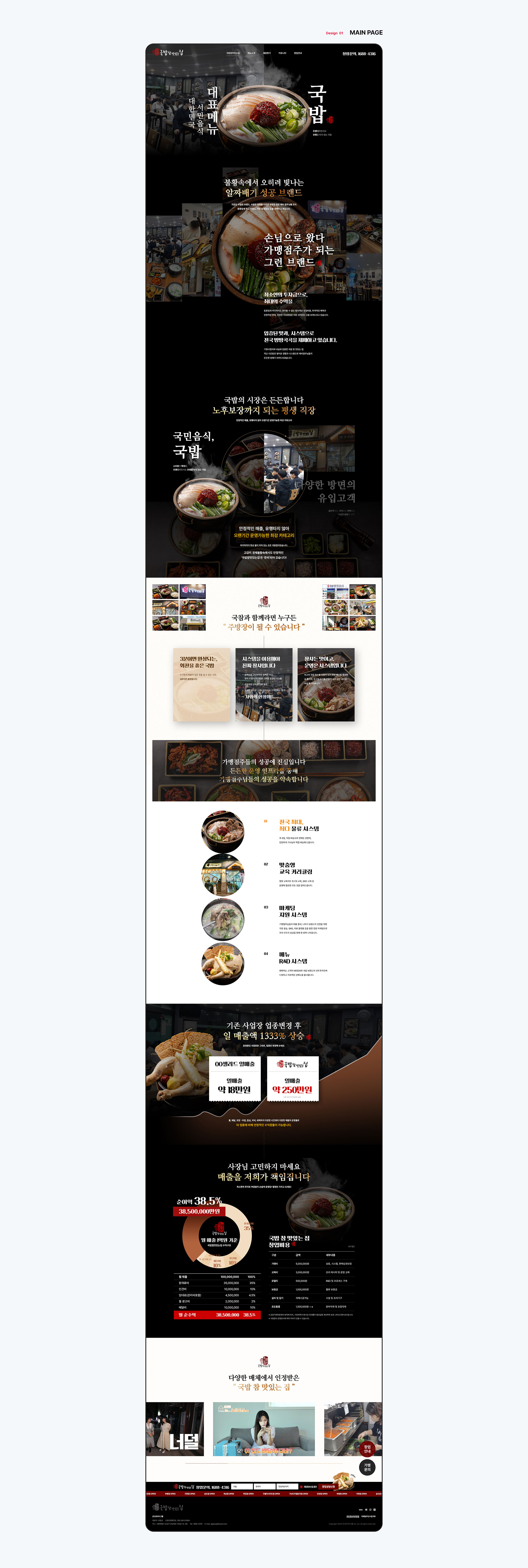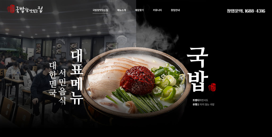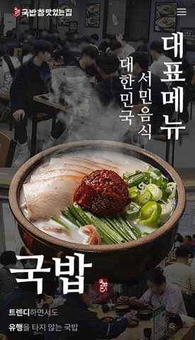 트렌디하면서도 유행을 타지 않는 대한민국 서민 음식 대표메뉴인 국밥 프랜차이즈 브랜드 국밥 참 맛있는 집의 공식 홈페이지를 반응형 웹으로 제작하였습니다. 전체적으로 정제된 폰트와 브랜드 아이덴티티가 담긴 컬러감을 일관되게 사용하여 디자인의 통일성과 트렌디함을 높였습니다.