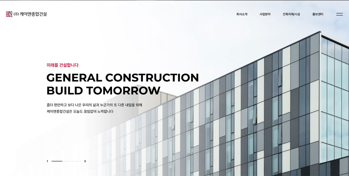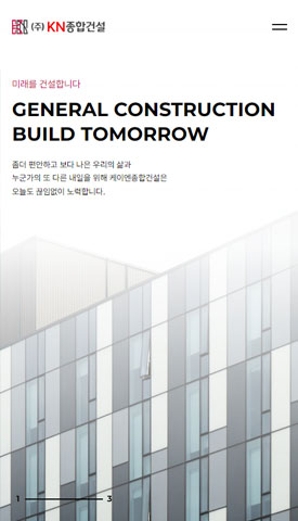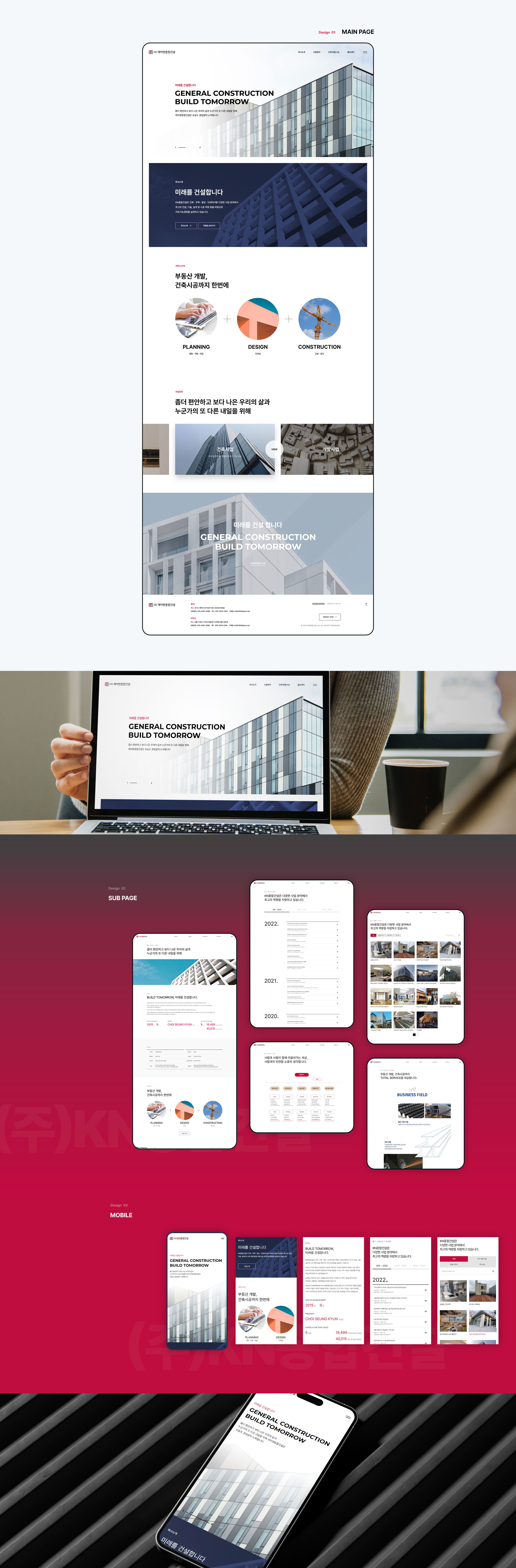 건축 · 주택 · 빌딩 · 인테리어 등 다양한 사업 분야에서 최고의 건설, 기술, 설계 및 시공 역량 등을 바탕으로 지속가능경영을 실천하고 있는 KN종합건설의 공식 홈페이지를 반응형 웹으로 제작하였습니다. 간결한 문구와 간소한 레이아웃으로 콘텐츠 중심으로 디자인을 구성하였고 기업의 신뢰성과 전문성을 고려하여 정돈되고 단순한 디자인 요소를 사용하여 제작하였습니다.