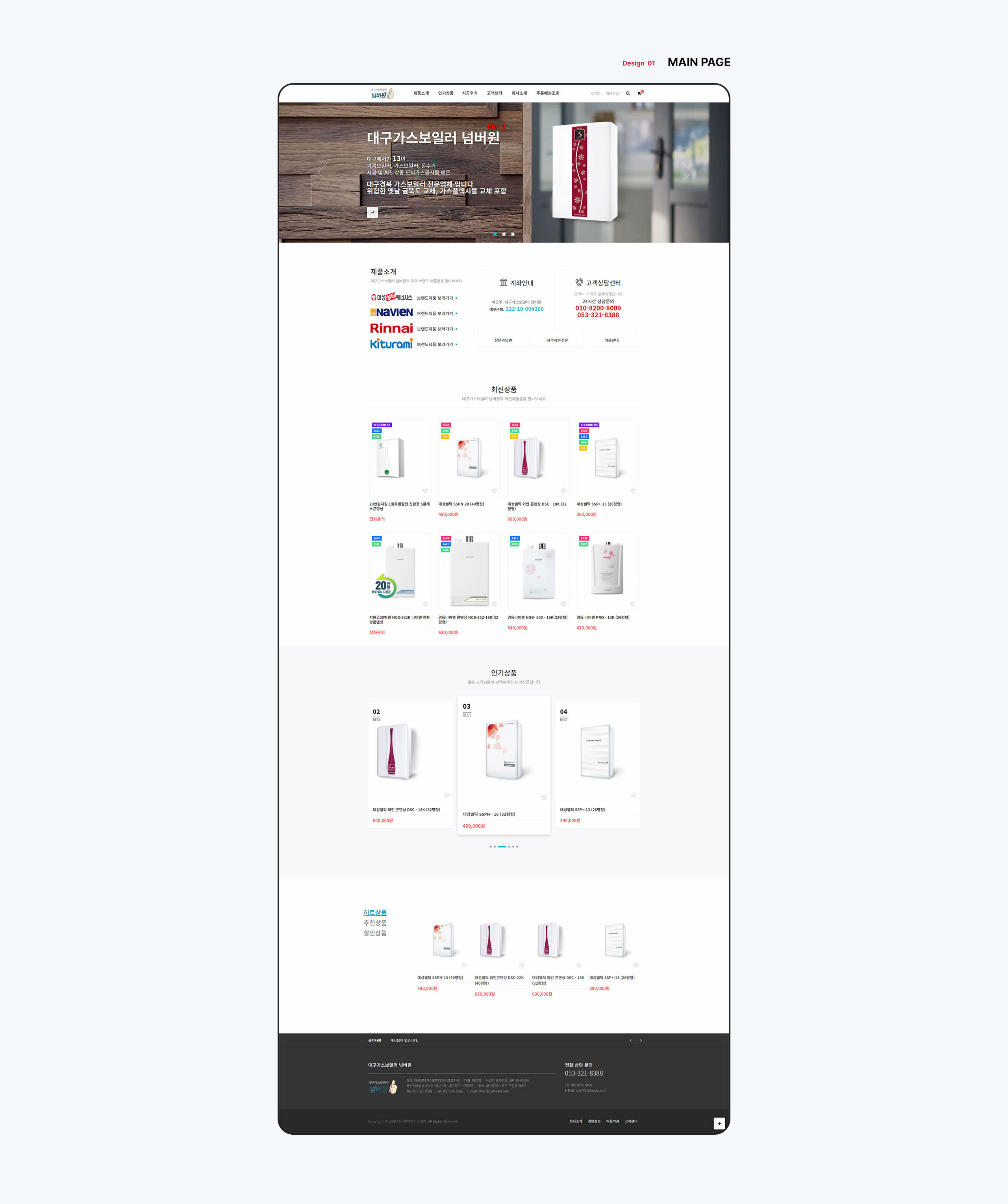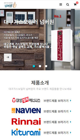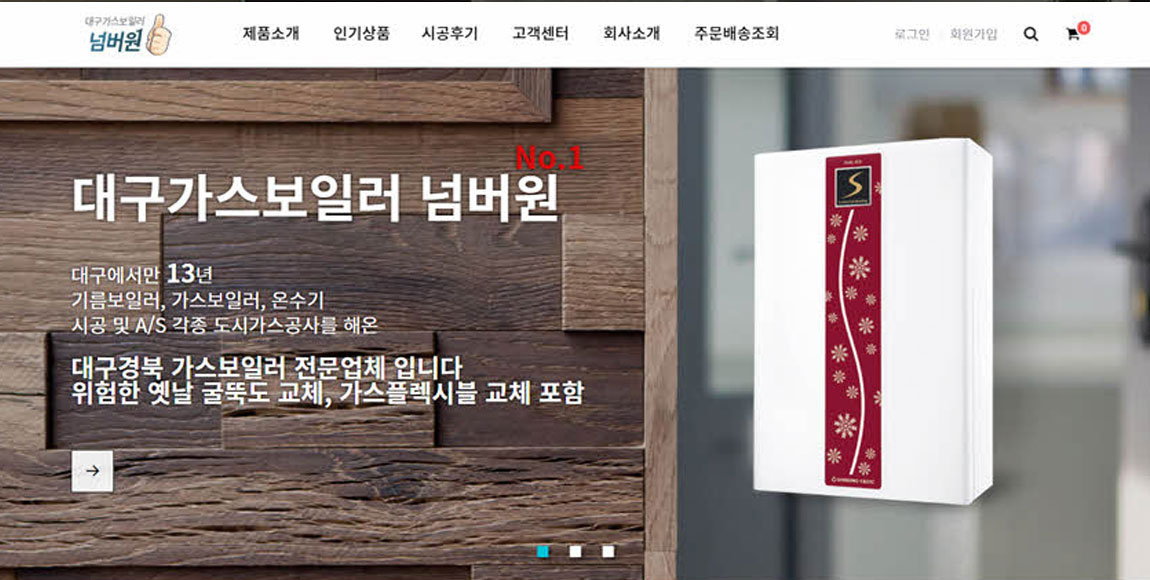 대구에서만 13년간 가스보일러, 기름보일러, 온수기 시공 및 A/S, 각종 도시가스공사를 해온 대구·경북 전문 업체 대구 가스보일러 최고의 홈페이지(쇼핑몰)를 제작하였습니다. 사용자가 정보에 온전히 집중할 수 있도록 구성한 레이아웃과 디자인을 적용하였습니다.