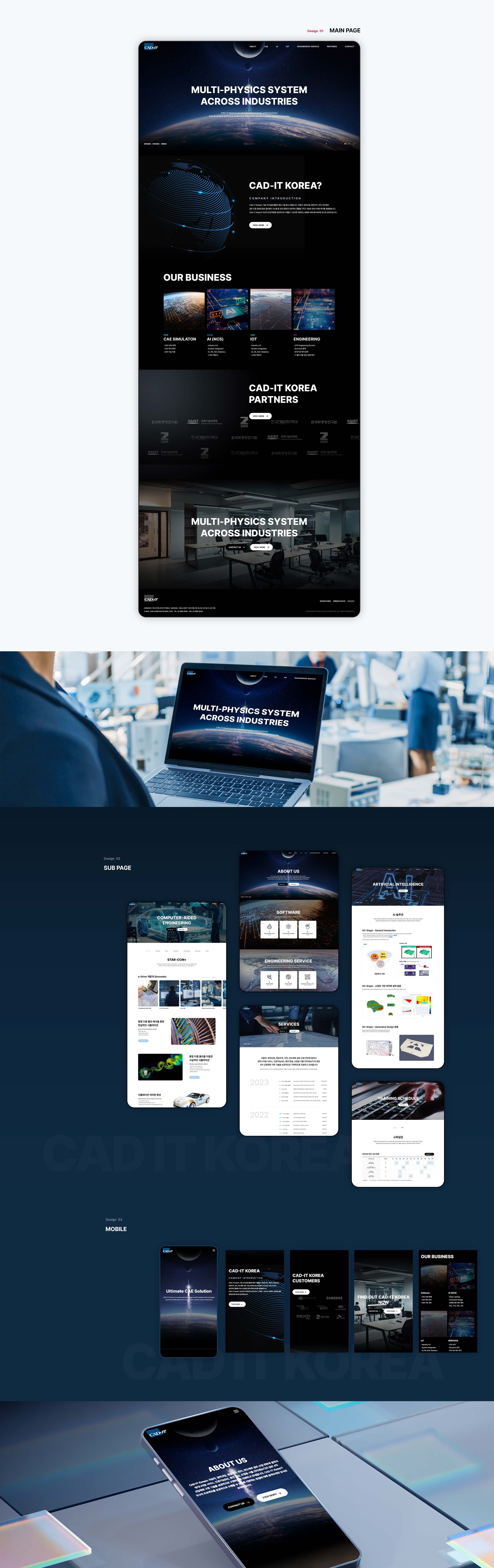 기술 리더십을 활용한 첨단 기술 중소기업 CAD-IT Korea의 기업 웹사이트를 제작하였으며 PC 및 모바일 분기 방식으로 작업되었습니다. 자동차, 방위산업, 항공우주, 전자, 반도체와 같은 산업 전반으로 20년 동안 성공적인 발전을 이뤄온 기업인 만큼 신뢰도를 줄 수 있는 디자인 콘셉트와 타이포를 중심으로 제작되었습니다.