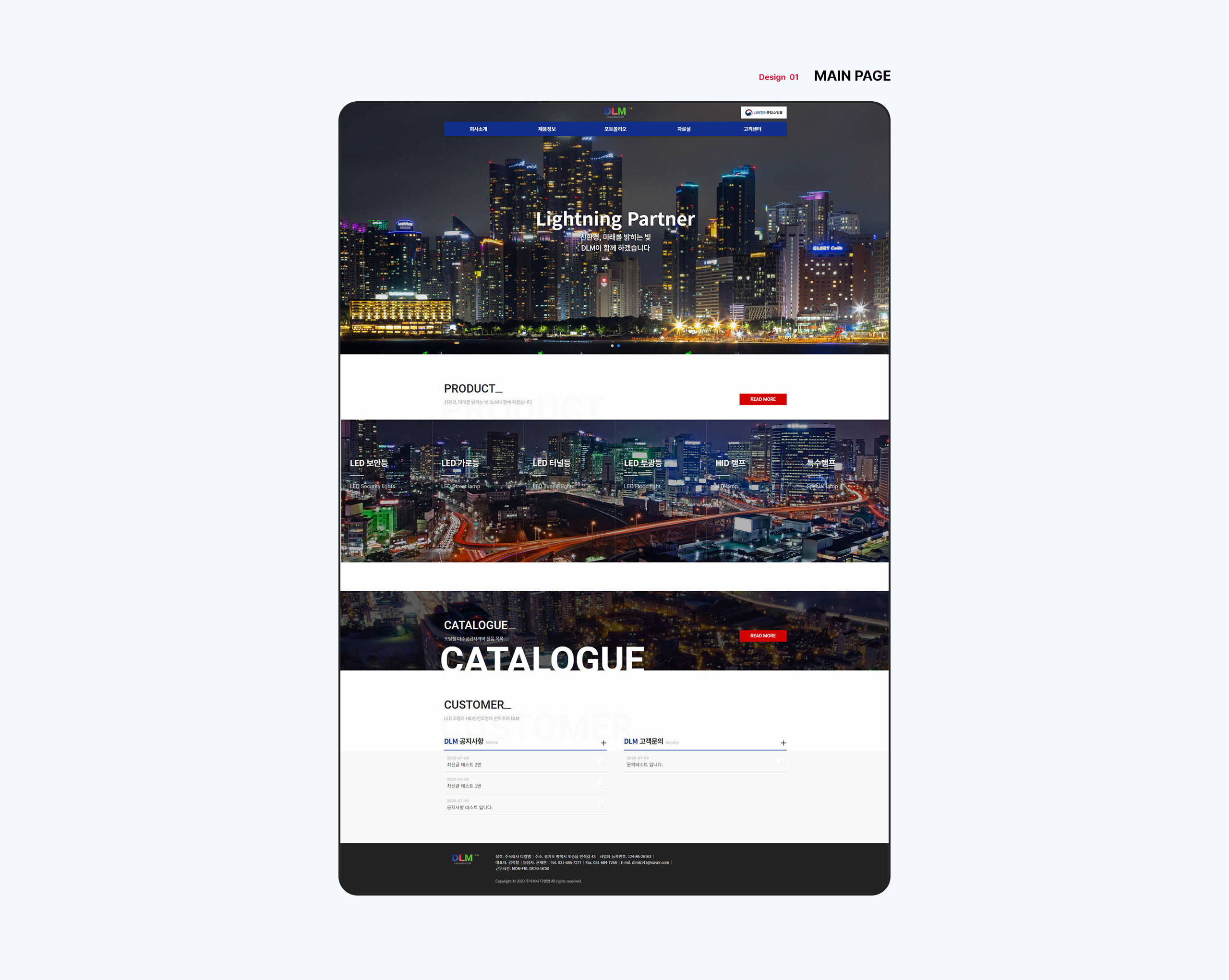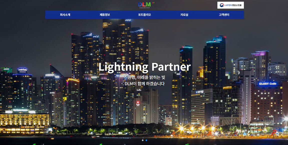 방전등 램프의 KS인증과 특수램프인 집어등 제작 특허를 시작으로 방전등 업계의 선두 주자로 발돋움하여 제품의 우수함을 인정받았으며, 그 노하우를 바탕으로 LED 조명을 시작하여 17년간 LED 조명과 HID 방전조명을 제작하고 있는 기업 DLM의 공식사이트를 반응형 웹으로 제작하였습니다. 고퀄리티의 이미지 위주와 핵심 정보만 노출해 가독성을 높이는 레이아웃과 심플하면서 기업의 아이덴티티와 기술력이 사용자에게 잘 전달이 될 수 있도록 구성하였습니다.
