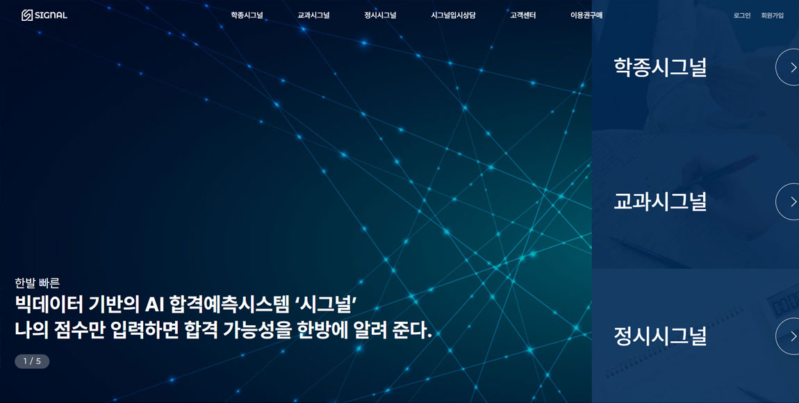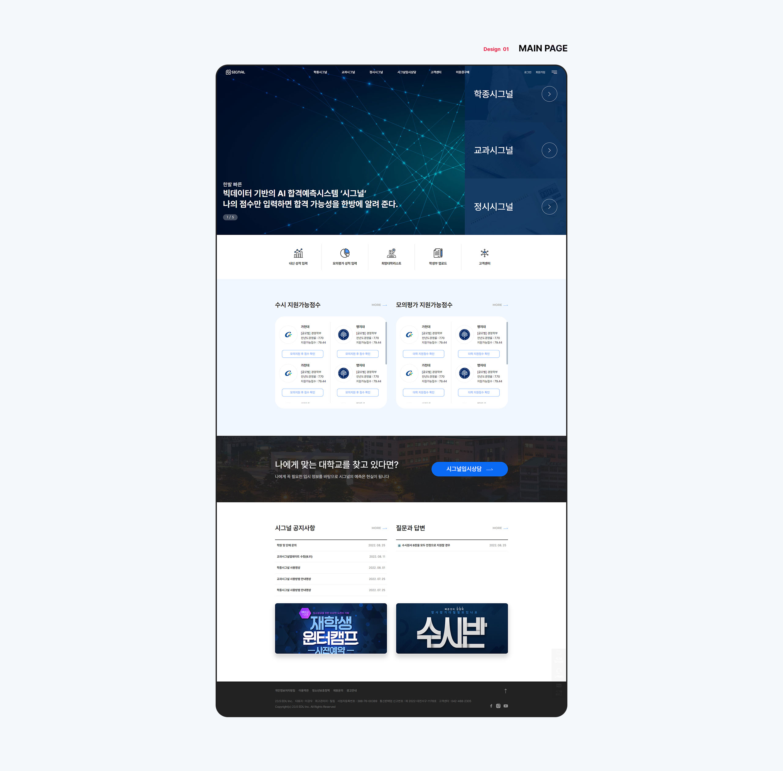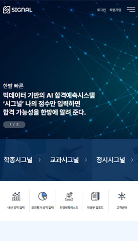 20년 경력의 입시전문가들과 진로 진학전문가, 빅데이터 전문가, 교육 공학 전문가들이 만든 국내 유일의 ‘학생부종합전형’ 성적 예측 시스템으로 사용자에게 꼭 필요한 입시상담을 진행하고 있는 기업 시그널의 기업 홈페이지를 반응형 웹으로 제작하여 사용자들이 다양한 기기에서도 서비스를 이용할 수 있도록 하였으며 기업의 로고 컬러를 인용하여 전체적으로 통일감을 주었으며 이미지와 텍스트를 적절히 배치 기업이 전달하고자 하는 메시지가 사용자들에게 쉽게 확인할 수 있도록 제작하였습니다.