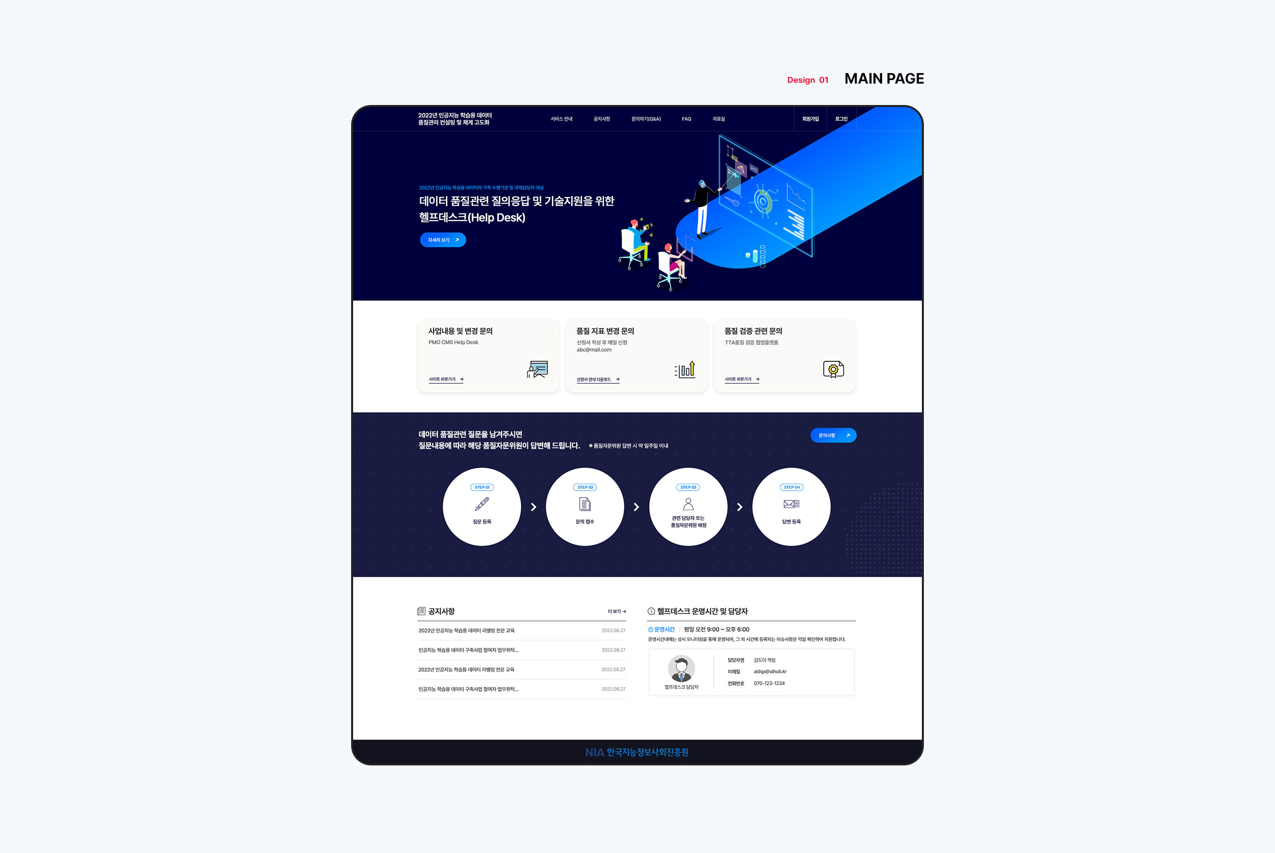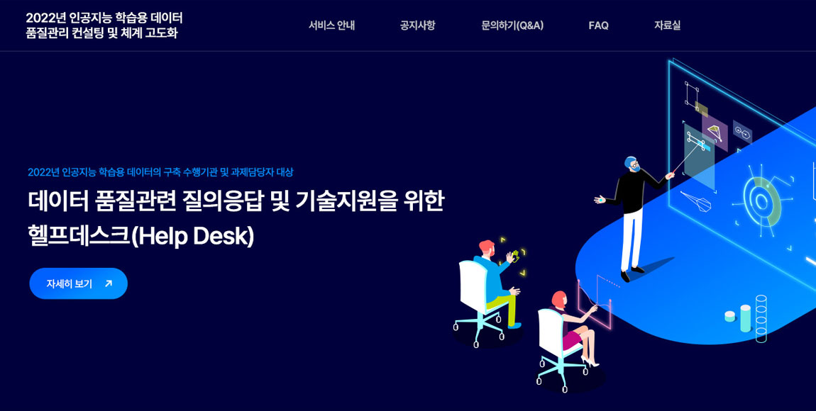 인공지능 학습용 데이터 품질 관련 컨설팅 및 체계 고도화를 위한 헬프데스크 기관인 한국지능정보사회진흥원 헬프데스크의 공식 홈페이지를 제작하였습니다. 다양한 기기에서도 서비스를 최적화된 화면으로 이용할 수 있도록 반응형 웹으로 제작하였으며 전체적으로 심플하면서 일러스트 이미지를 디자인 요소로 사용하여 사용자들이 더욱 쉽게 정보를 얻을 수 있도록 디자인하였습니다.