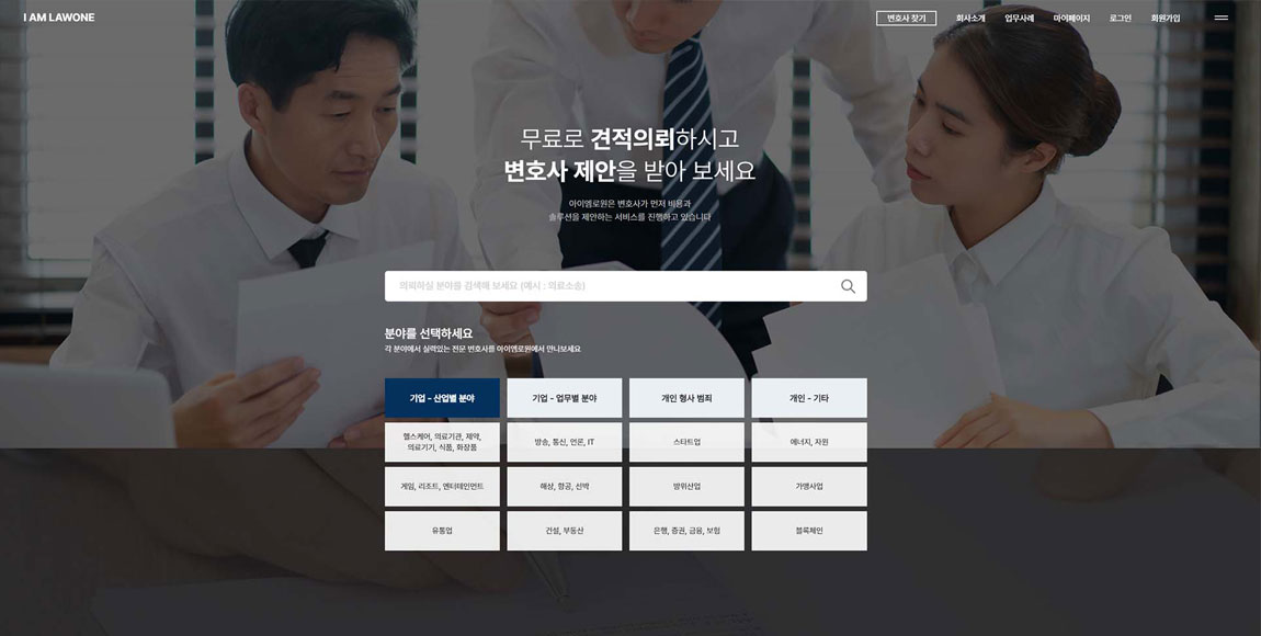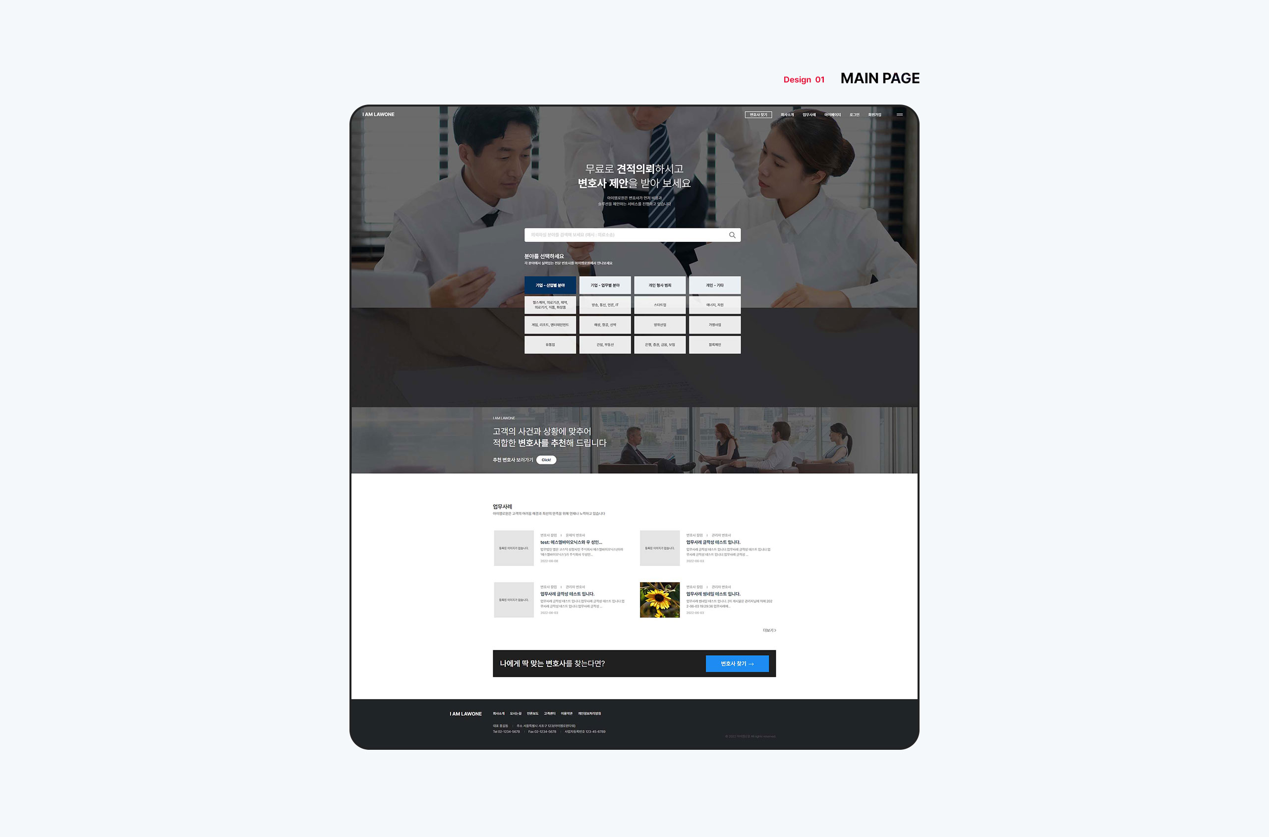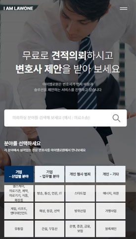 고객의 사건과 상황에 맞추어 적합한 변호사를 추천해 솔루션을 제안해주는 아이엠로원의 공식사이트를 반응형 웹으로 제작하였습니다. 기업의 업무 특성상 사용자에게 신뢰감과 정보전달력이 중요하므로 기업의 이미지를 강화하고, 심플한 레이아웃으로 제작하였습니다.