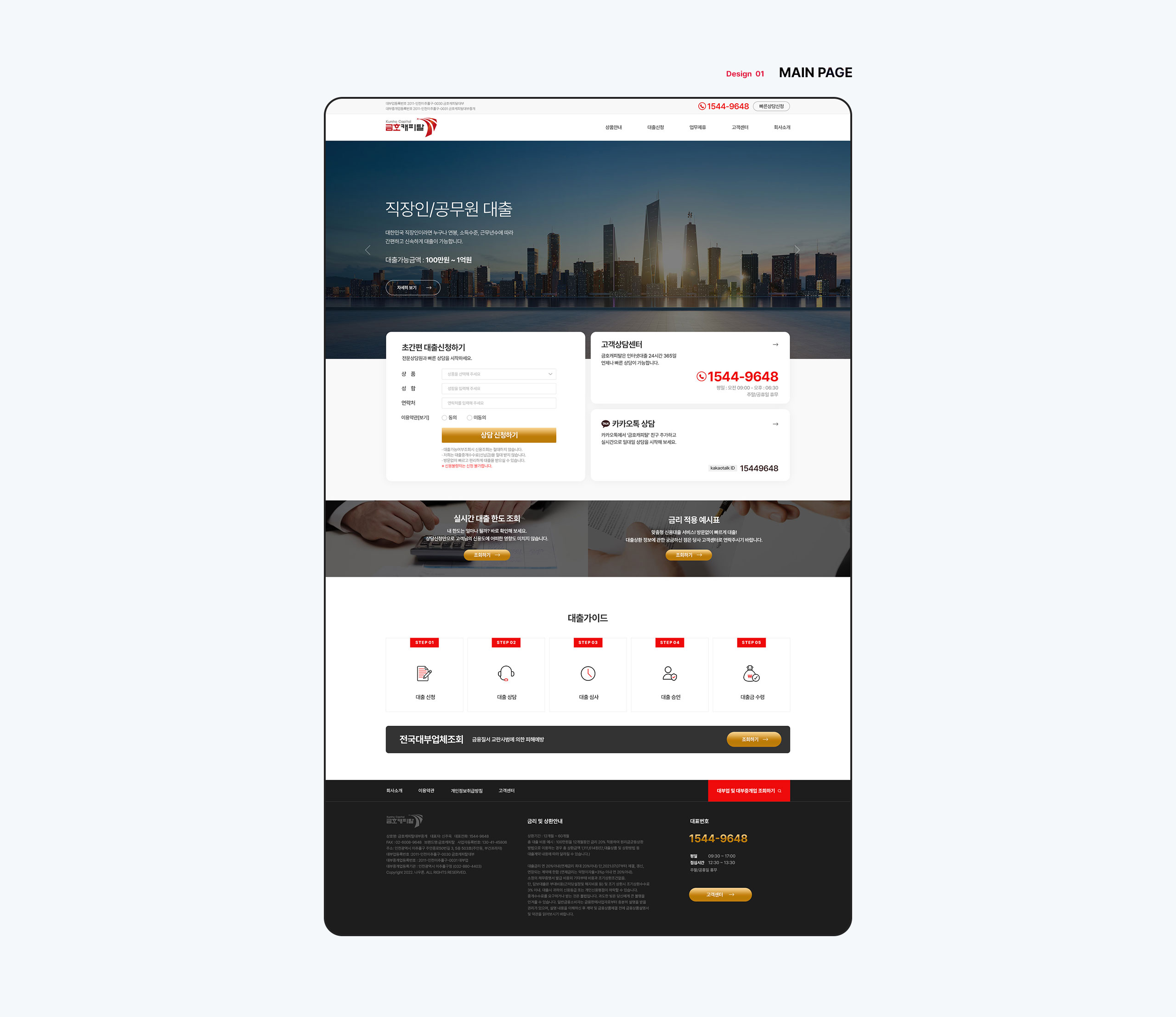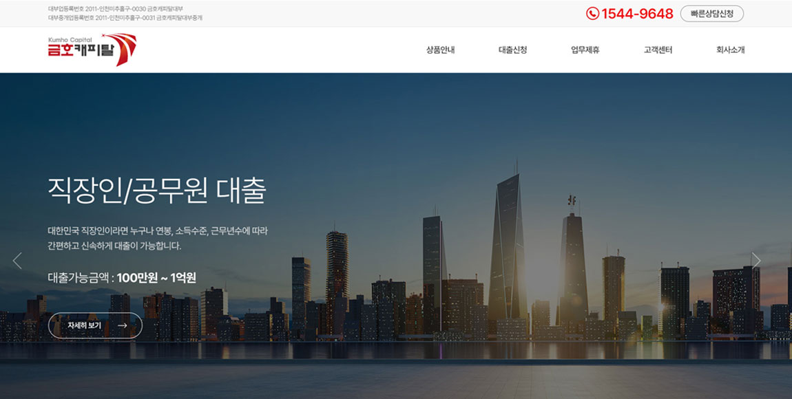 사금융사용 중에도 인터넷 대출 상담이 가능하고 방문 없이 빠르고 편리하게 넉넉한 은행 대출 서비스를 제공하는 금호 캐피탈의 공식사이트를 제작하였습니다. 심플하면서 간결하게 불필요한 요소들을 덜어내고 이미지와 텍스트를 적절히 배치하여 기업의 전문성과 신뢰감 전달을 목표로 제작하였습니다.