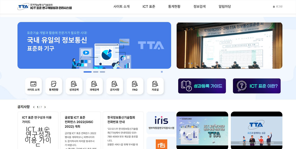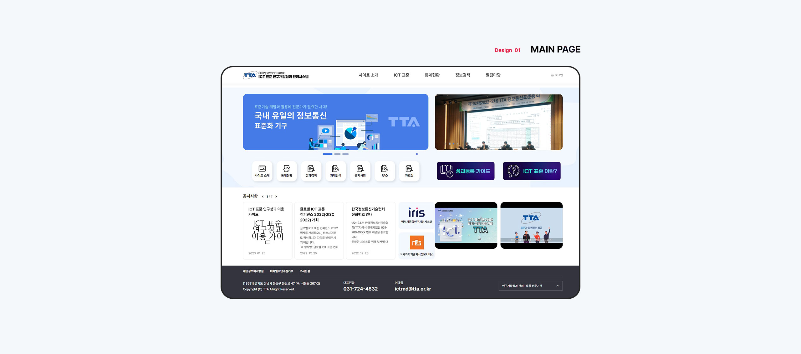 정보통신기술의 표준 제정, 보급 및 시험인증 지원을 위하여 설립된 법정 기관으로서, 1988년 설립 이후 우리나라 ICT 표준화와 시험인증의 구심점 역할을 하는 기관인 한국정보통신기술협회의 ICT 표준화 관리시스템 공식사이트를 반응형 웹으로 제작하였습니다. 아이콘과 텍스트, 이미지를 적절히 배치하였으며 사용자들에게 정보에 쉽게 접근할 수 있도록 레이아웃을 구성하고 색감과 폰트는 전체적으로 통일감 있게 제작하였습니다.